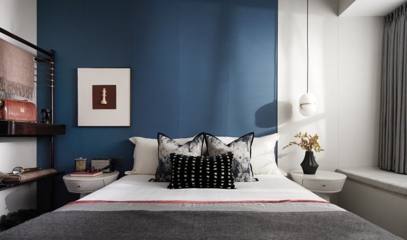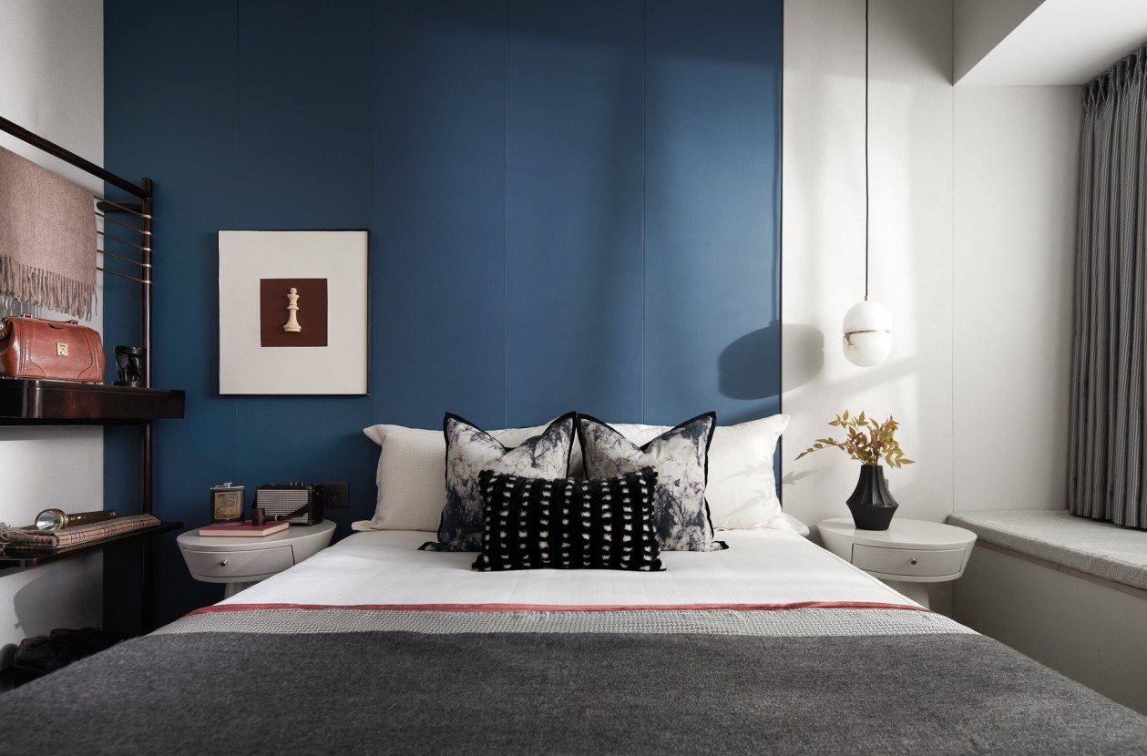 主臥室中延續(xù)整體黑白灰素色為基礎的主色,大面積點綴以優(yōu)雅的質(zhì)感藍色調(diào),而讓空間更有了生趣與生活的味道