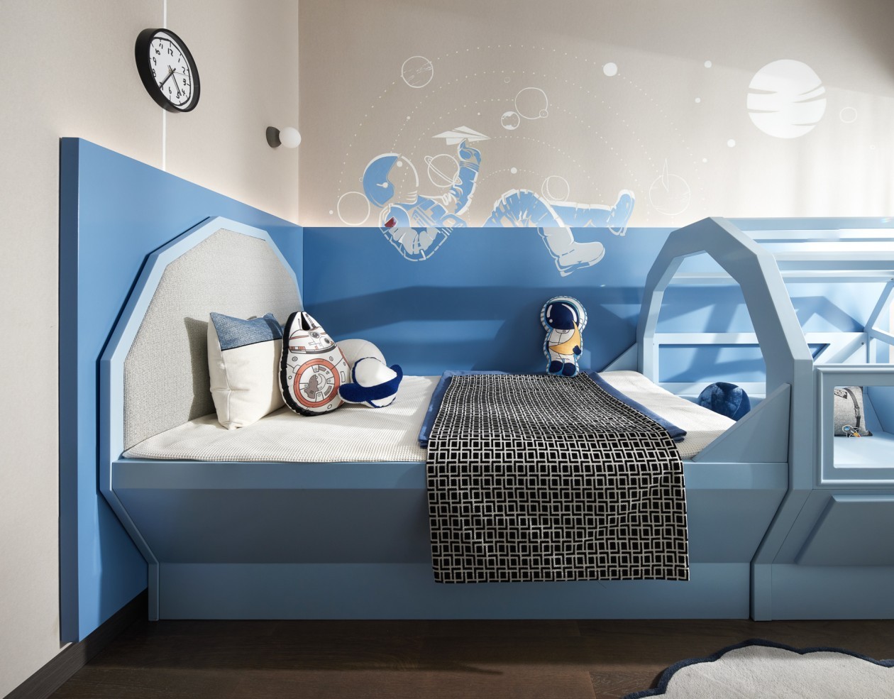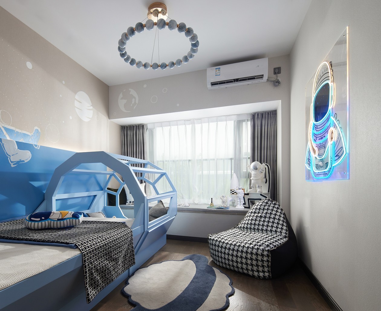 活潑可愛,喜歡小王子,長高后夢想當宇航員的5歲的男孩房,整個空間被打造為夢想中的藍色太空空間