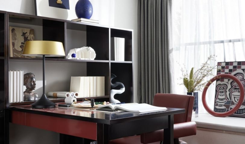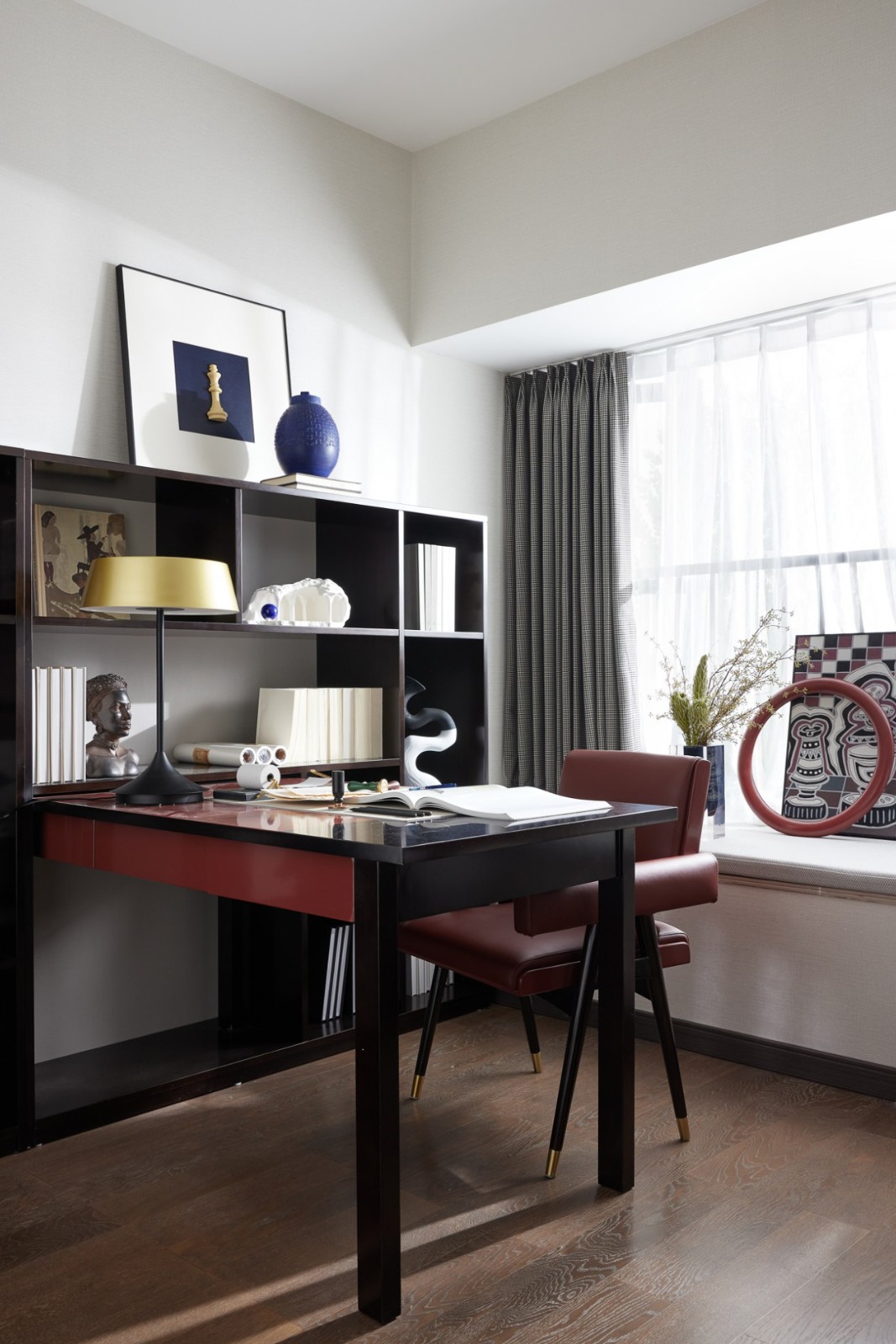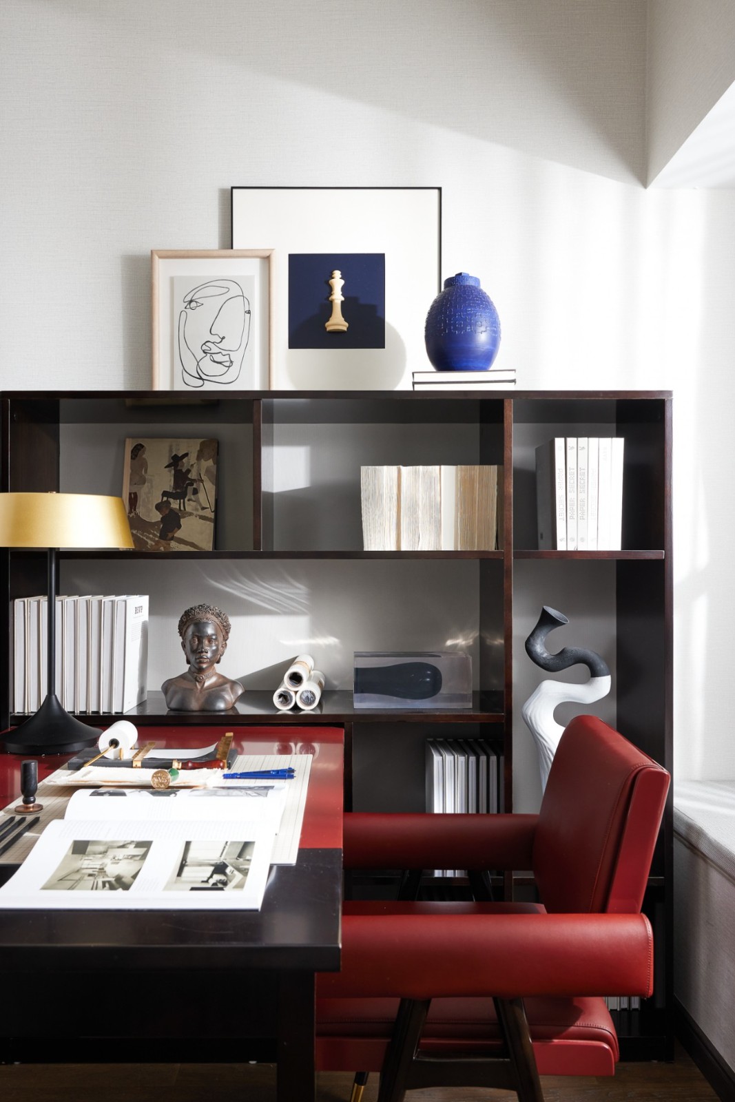 設計師在書房的設計中,沿用了父母房飽和度較高紅色和藍色的應用
