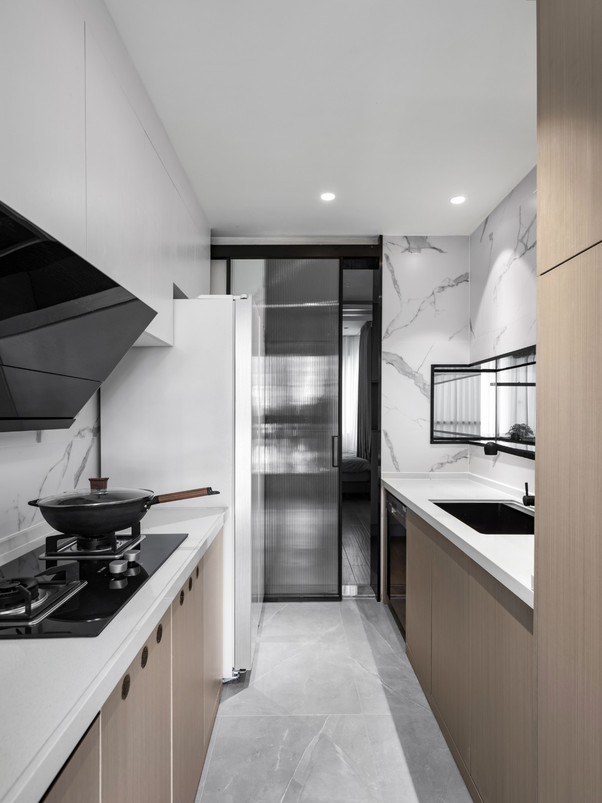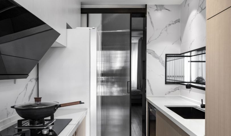 廚房使用了長虹玻璃推拉門,保證了玄關(guān)的采光,也多了一絲絲美感。