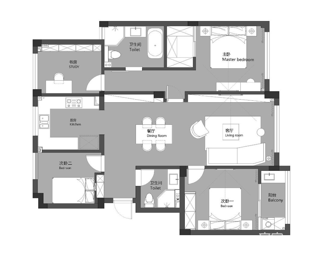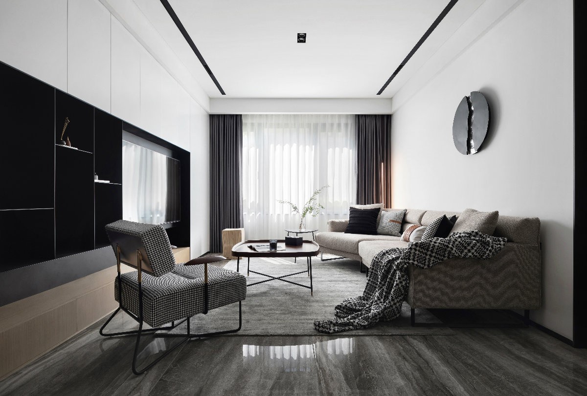 于白色的基調(diào)中,黑色與灰色作為點(diǎn)綴色,讓空間統(tǒng)一又富有變化。加上無主燈的設(shè)計(jì),更加簡約大氣。客 餐廳一體化的設(shè)計(jì),黑色線條延伸整個(gè)頂面。