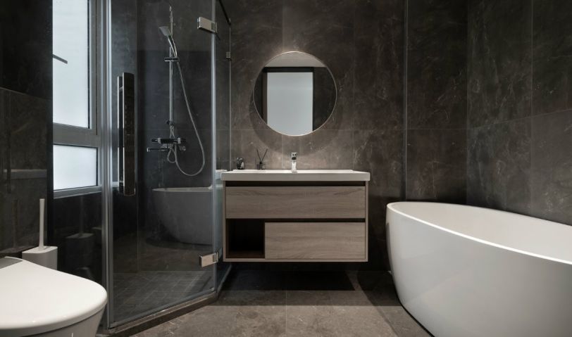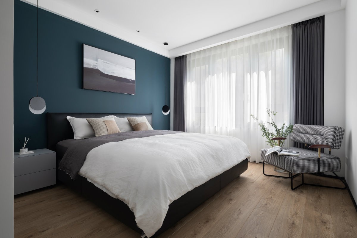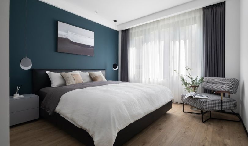 床頭使用深藍(lán)色的墻面,黑色皮質(zhì)床質(zhì)感十足,搭配灰色布藝單椅,素雅而又一絲活潑,歲月靜好,悠然的 生活氣韻。