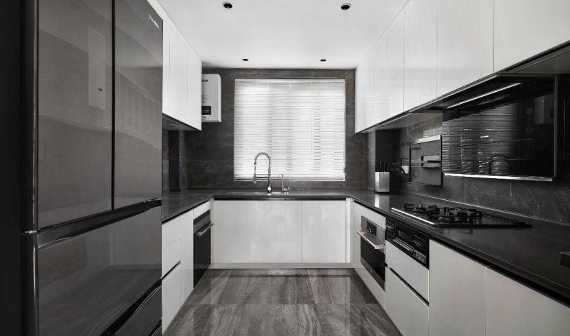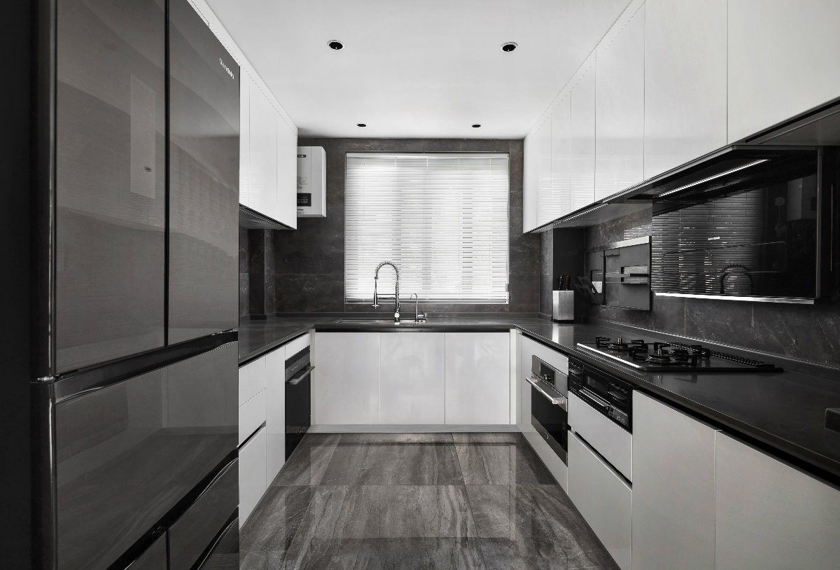 于白色的基調(diào)中,黑色與灰色作為點(diǎn)綴色,讓空間統(tǒng)一又富有變化。加上無主燈的設(shè)計(jì),更加簡約大氣???餐廳一體化的設(shè)計(jì),黑色線條延伸整個(gè)頂面。