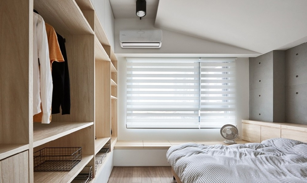 主臥原木色衣柜和地板,灰色的床品,濃濃的無印風(fēng),簡約自然。