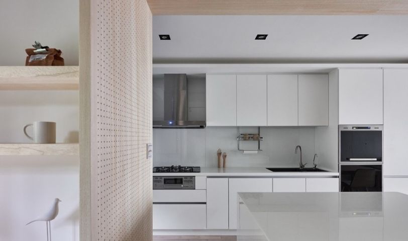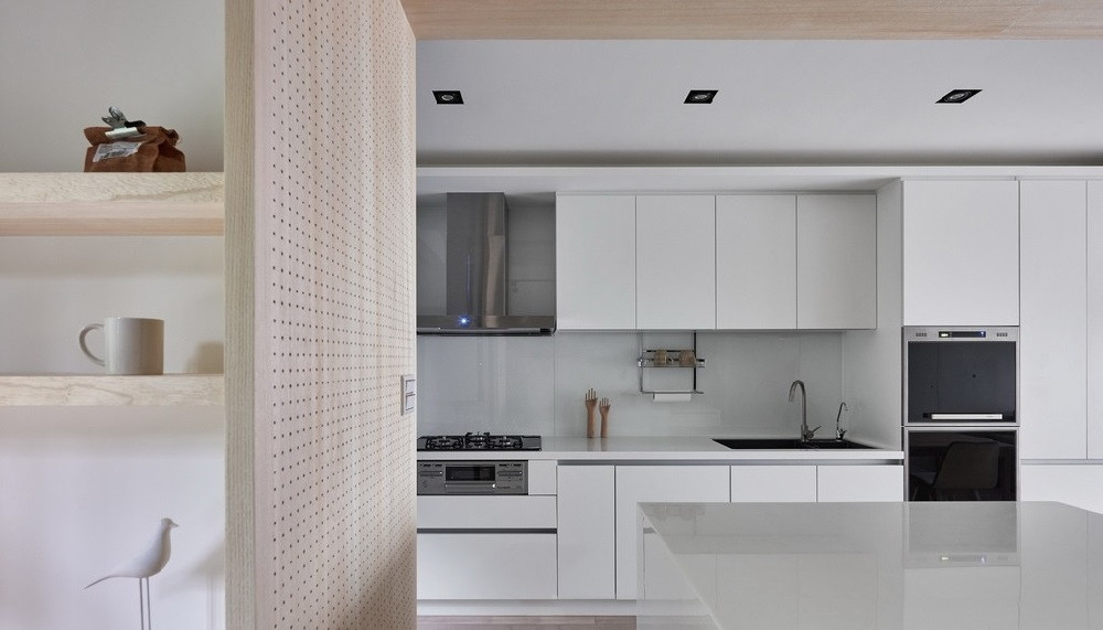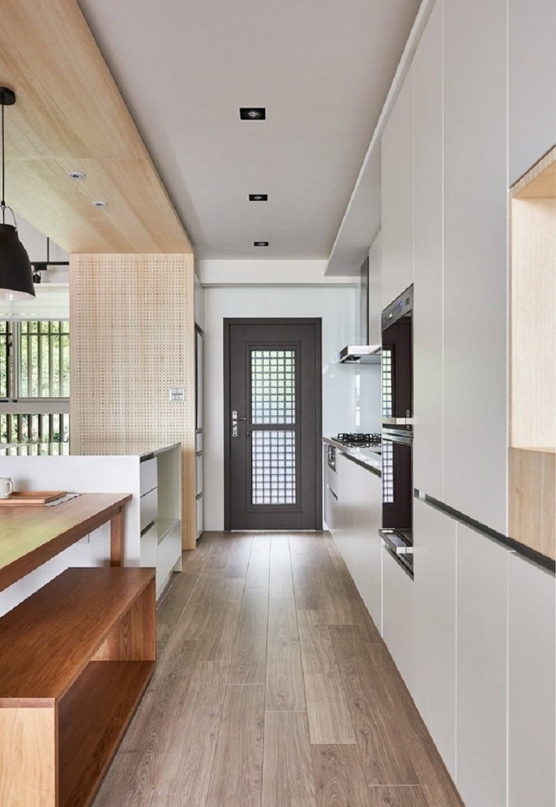 冰箱柜隱藏在洞洞墻的后方,因?yàn)樯疃汝P(guān)系,冰箱后柜也可以利用變成淺收納柜。