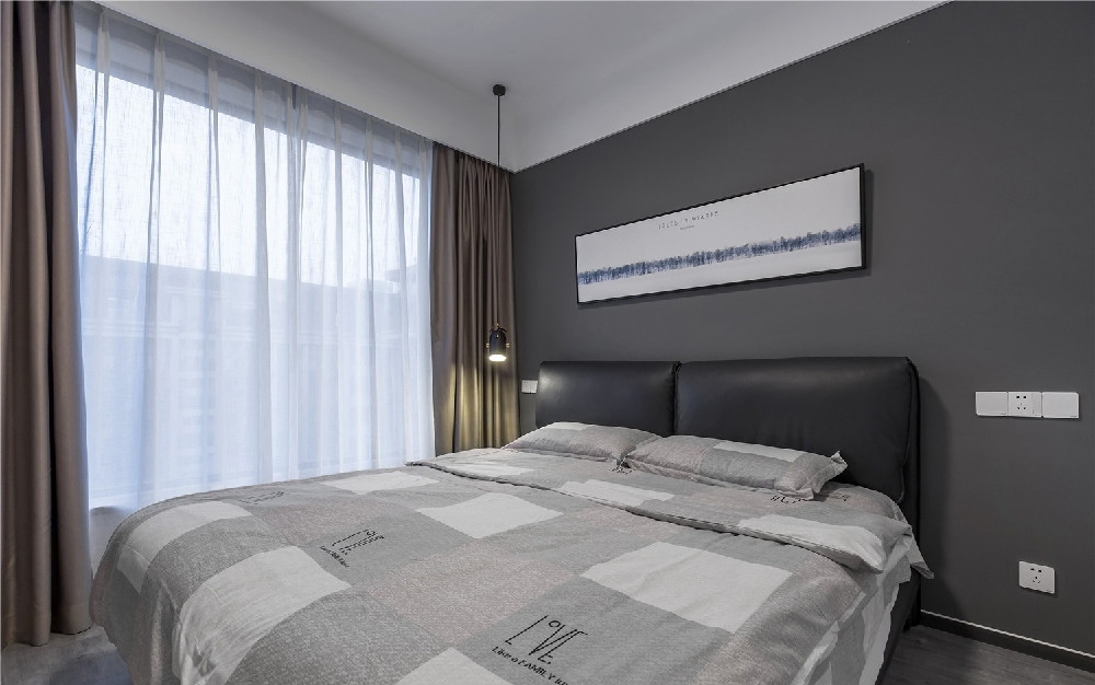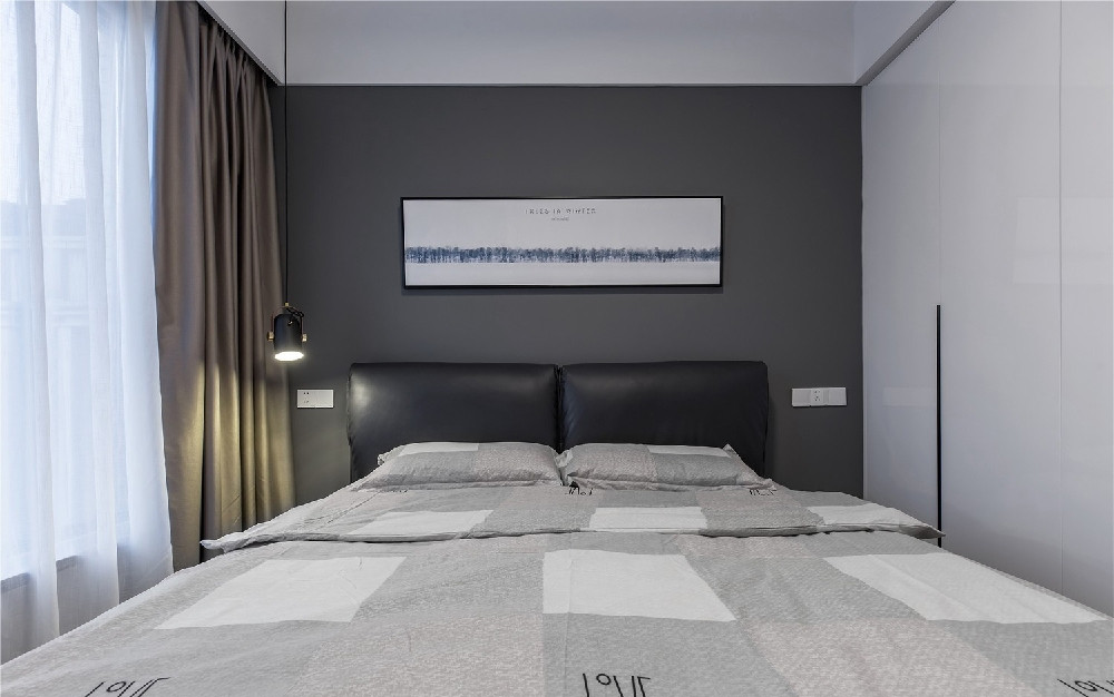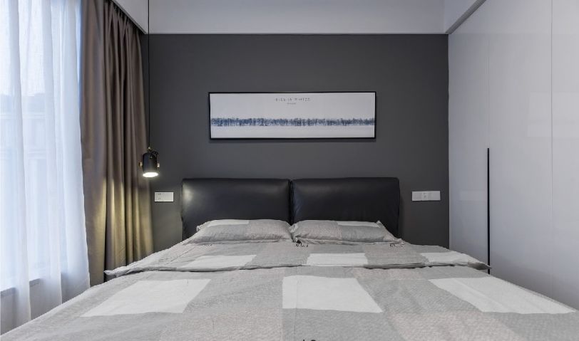 臥室空間的主軸色以灰色為主,降低高彩度來強(qiáng)調(diào)空間感受,臥室嘛,就是放松、懶散的地方。