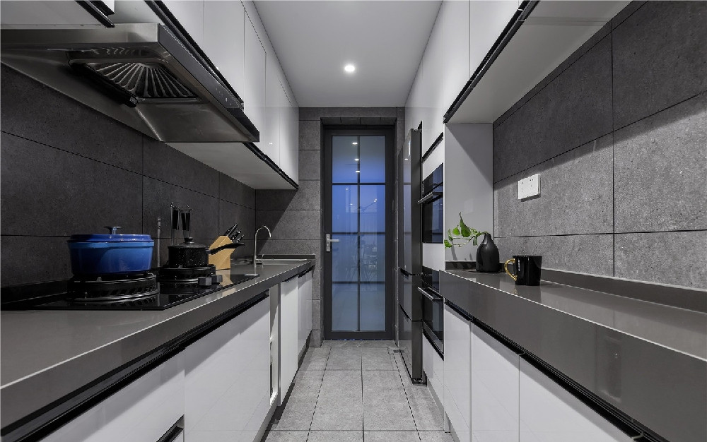 對(duì)于廚房的規(guī)劃,業(yè)主說實(shí)用性要強(qiáng),歸置一個(gè)雙開門的冰箱,原廚房的操作臺(tái)面只有3米,無法滿足這些需求,因此在這塊空間的改動(dòng)較大,將廚房與書房之間的墻體拆除,并向書房借用了40公分來彌補(bǔ)廚房空間,滿足最初的功能規(guī)劃。
