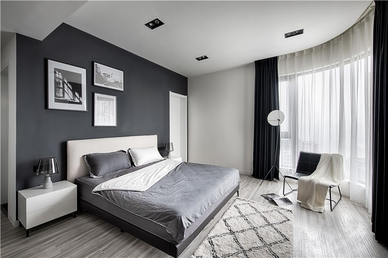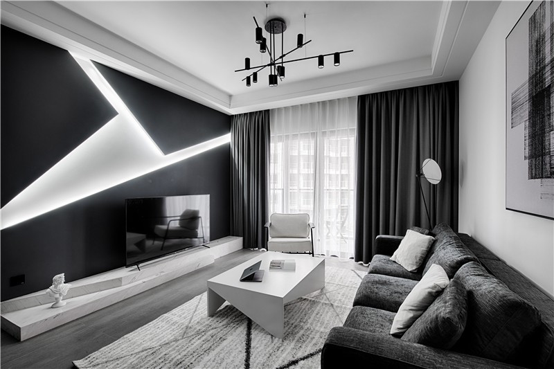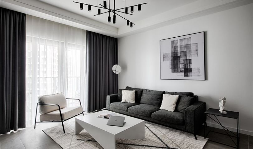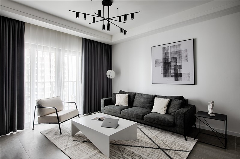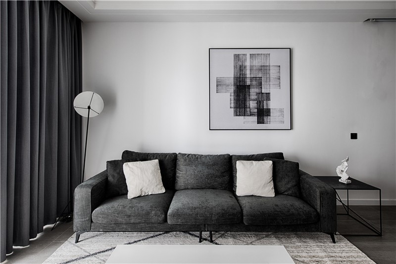 沙發(fā)和窗簾是不同灰度使用,大白墻只用一幅抽象的黑白掛畫裝飾。