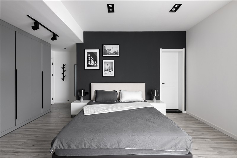 在用色上面同樣是考慮黑白灰三色的交替使用,床頭墻面使用黑色,掛畫使用黑邊白底內(nèi)容同為黑色。