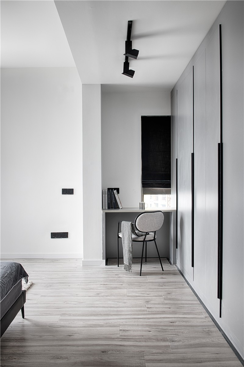 主臥室沒有在單獨分隔衣帽間,而是直接做的整墻衣柜,目的是盡可能讓主臥室的空間暴露出來,以滿足業(yè)主對于大空間主臥室的需求。