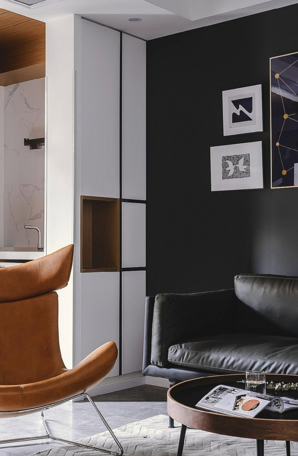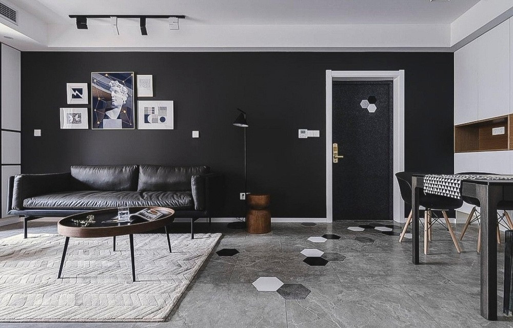 入戶門廳采用地磚鑲嵌六角磚的形式,增加了入戶的趣味性,同時從視覺上達(dá)到了區(qū)域分割。大塊面的黑色背景營造出簡約硬朗之感,點(diǎn)綴溫潤木色,平衡空間色彩。