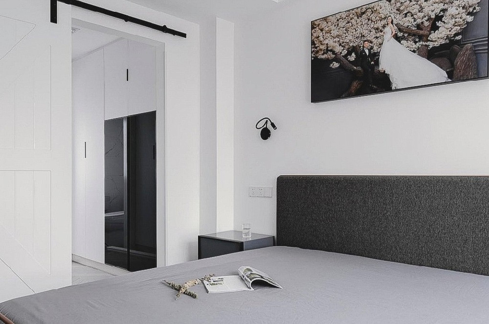 臥室延續(xù)了黑白灰的整體格調(diào),通向更衣間加掛了谷倉門,起到了區(qū)域分割的作用同時又兼具裝飾效果。