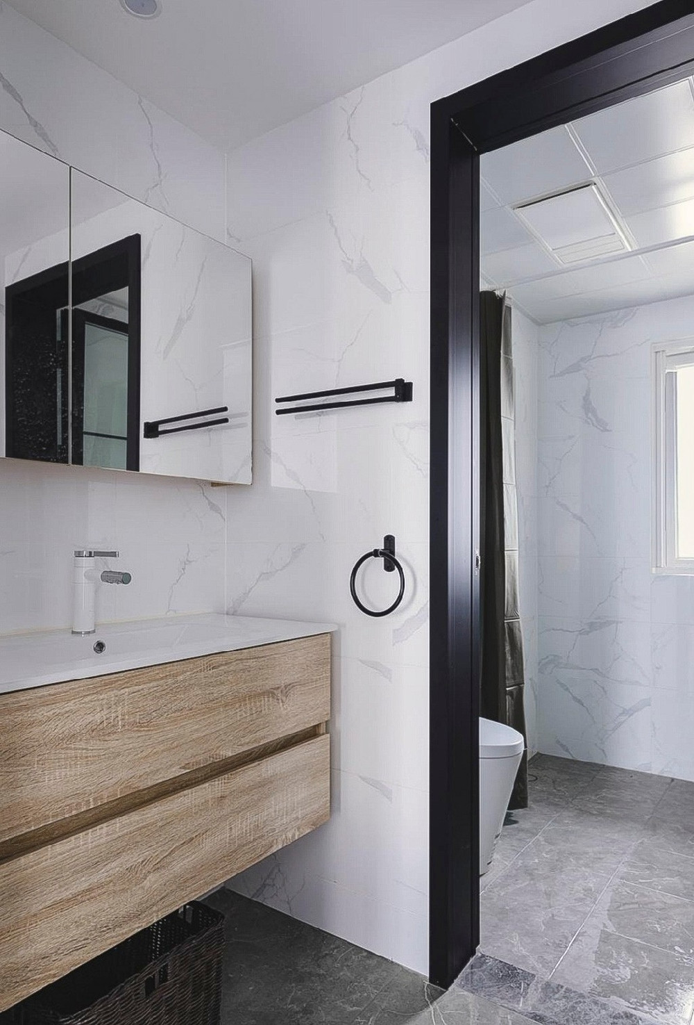 同樣以黑白灰為主色調(diào)的衛(wèi)浴空間,加入木色臺盆柜的設(shè)計,空間層次更分明。