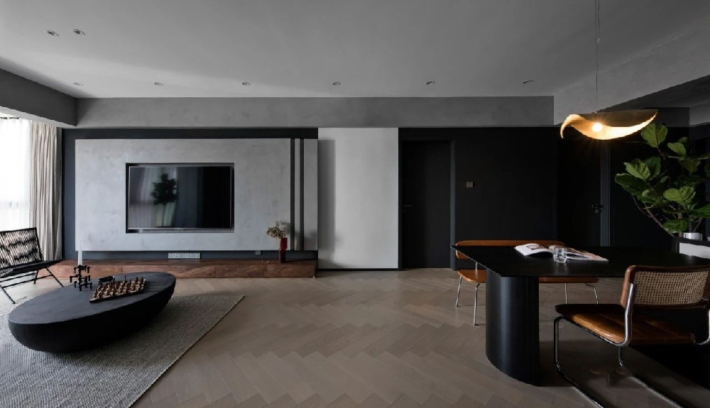 設(shè)計師在全屋設(shè)計上以水泥漆,黑白烤漆、人字拼木地板為主,主色灰與黑。搭配實木電視柜、實木五斗柜、藤編座椅、以及綠色植物,平衡空間的冷暖。在現(xiàn)代簡約的家中觸摸復(fù)古元素。