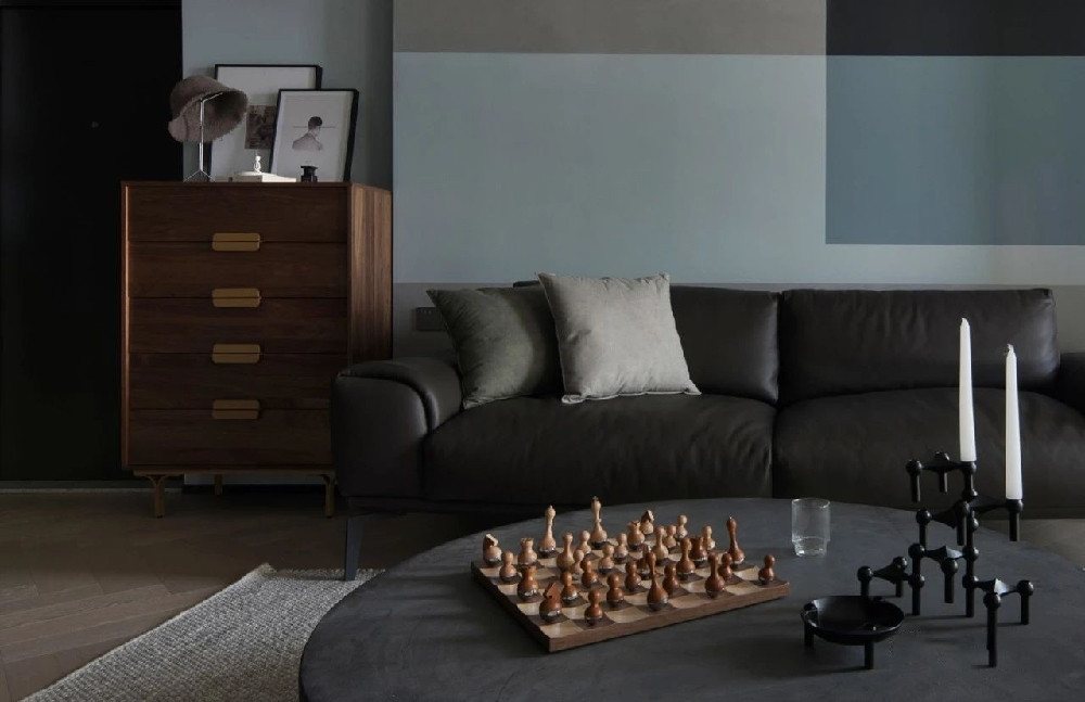 客廳選用的茶幾,表面的水泥質(zhì)感明顯可見,為空間奠定復(fù)古格調(diào)。同時,圓的造型方便家人圍坐,無論下棋還是桌游,只要聚在一起,就能制造不平常的記憶。