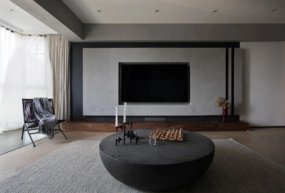 先以木作打底,形成基本造型后刷上素色水泥漆;再于右側(cè)切割出兩條立體錐形豎條,打破墻面的呆板感;最終落成簡約而時尚的電視背景墻,黑色的電視機(jī)協(xié)調(diào)地嵌于其中。在“黑墻”上,灰色的電視背景墻凸顯而出,更具體塊感。