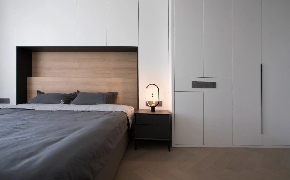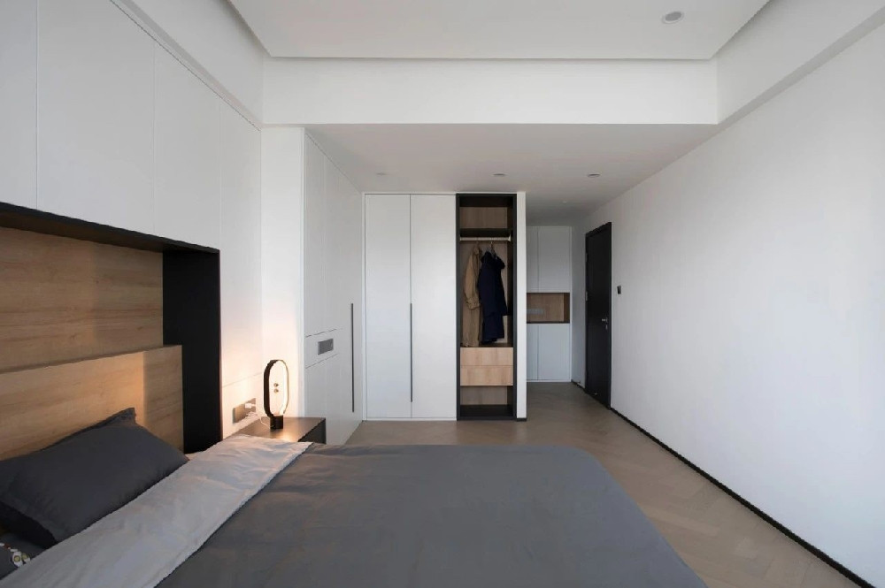 臥室是一個完全私密和放松的場所,摒除不必要的裝飾,減少生活的累贅。墻面上毫無多余修飾,床后白色的收納柜在營造簡潔氛圍的同時可以存放大量書籍,滿足H喜愛在房中看書的需求。