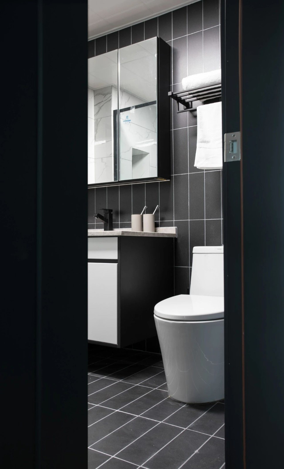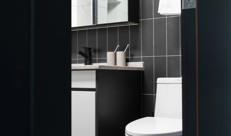 黑色的衛(wèi)生間符合全屋的格調(diào)。設(shè)計師利用鋪設(shè)墻地一體的瓷磚,讓小小的空間有了延伸感。