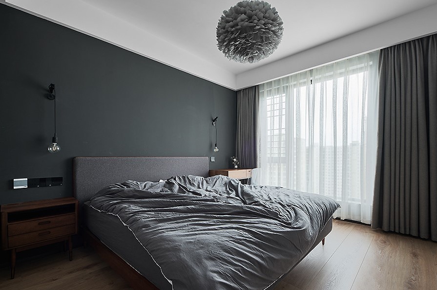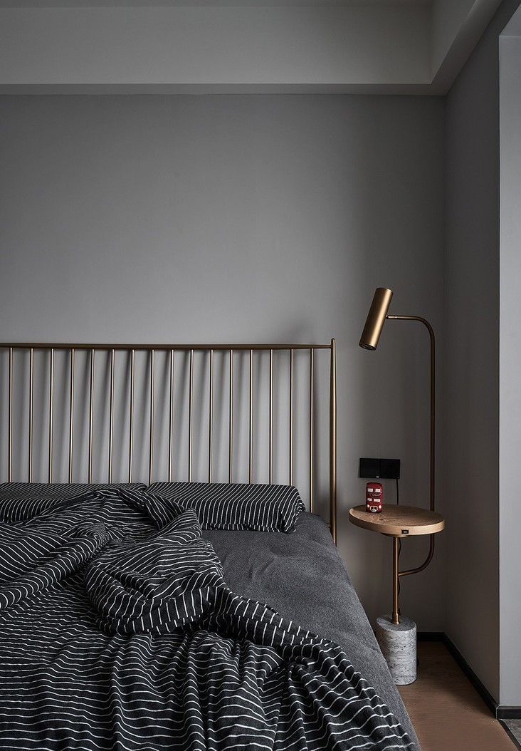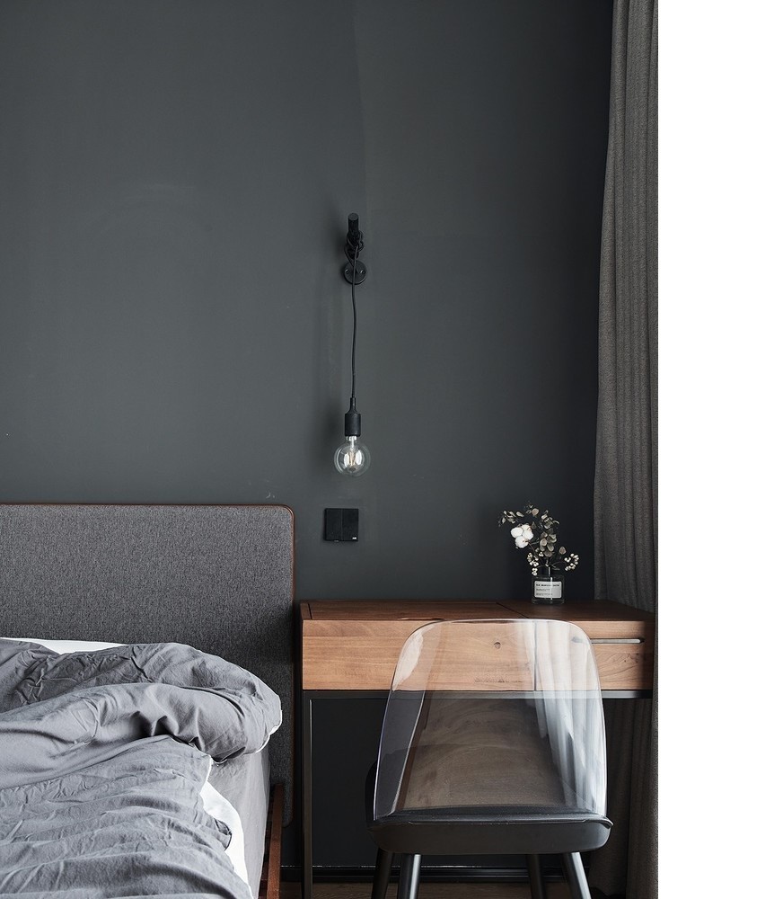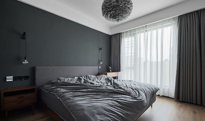 主臥整體以暗灰為主色調(diào),柔軟的織品,溫暖的木地板,完美營(yíng)造舒適放松的睡眠環(huán)境。