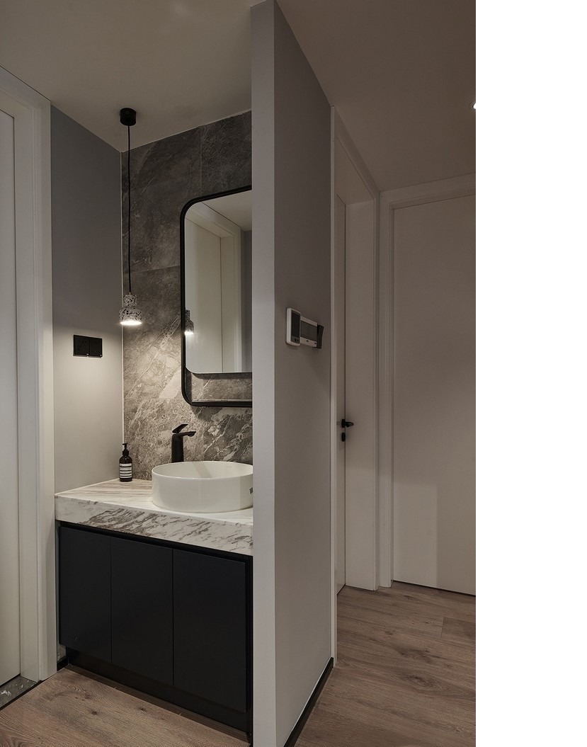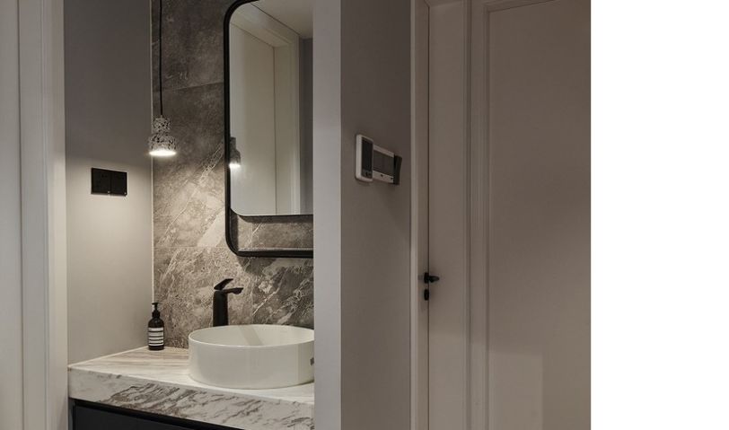 衛(wèi)生間干濕分離提高居住品質(zhì),干區(qū)墻面以仿大理石磚+防水乳膠漆打造,充滿了高級(jí)質(zhì)感。臺(tái)盆與鏡子采用偏離中心式擺放方法,在美觀的同時(shí)兼顧實(shí)用。