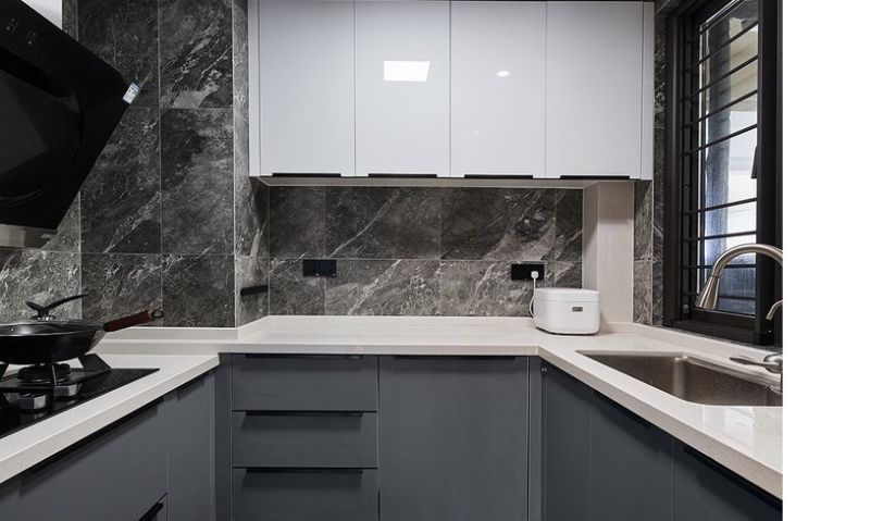 廚房,仿大理石磚與雙飾面門板打造通透敞亮的空間。高低臺(tái)面的設(shè)計(jì),提升廚房的使用體驗(yàn),烹飪時(shí)更加方便。