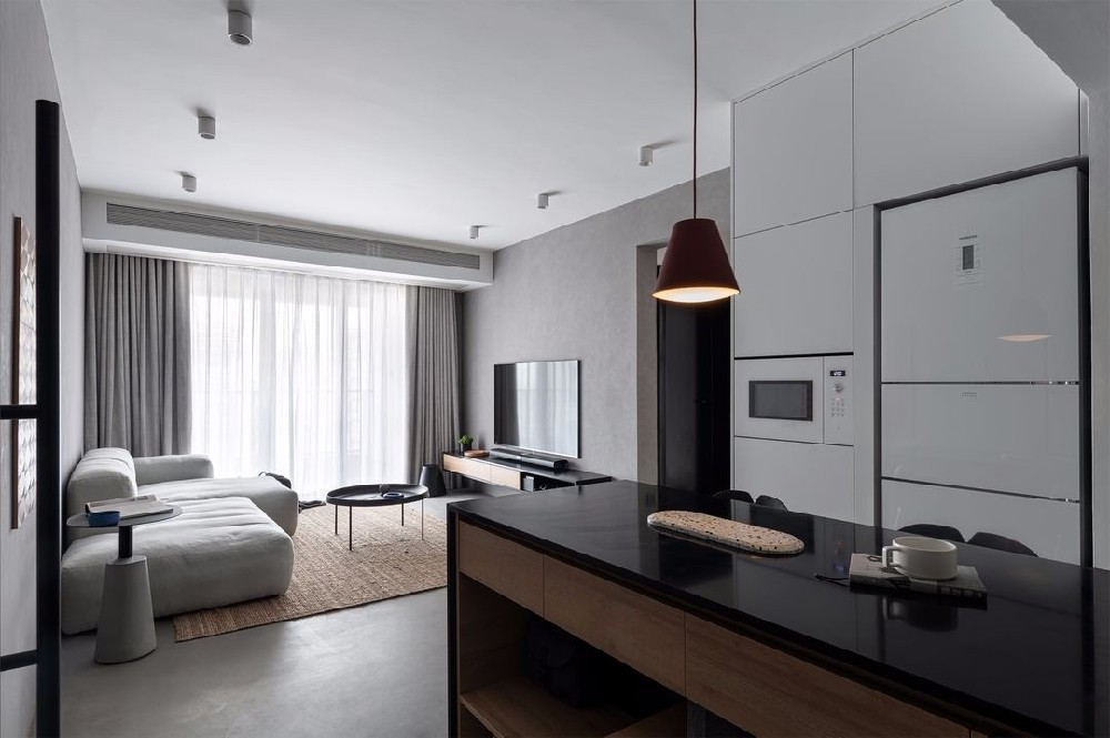 一進(jìn)門的視野決定了對(duì)空間的主觀印象,所以在廚房的設(shè)計(jì)上做了全部開放的形式,使得公共空間的可視范圍加大從而得到遠(yuǎn)原超原戶型的空間享受。整體空間包括家具配飾的色調(diào)都沒(méi)有做大的跳躍和對(duì)比手法,也是增強(qiáng)空間感的重要因素。