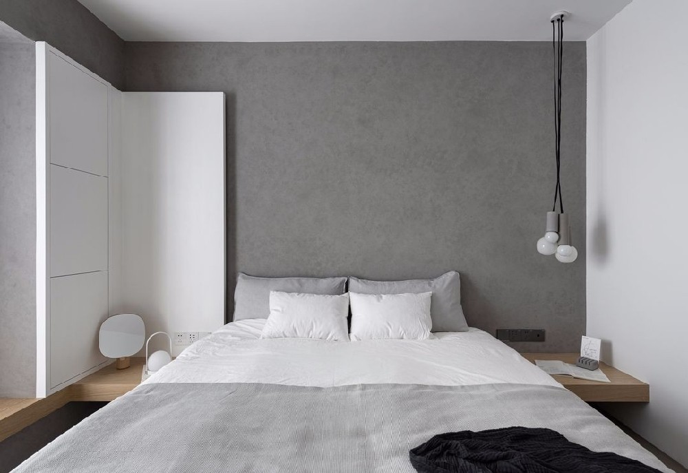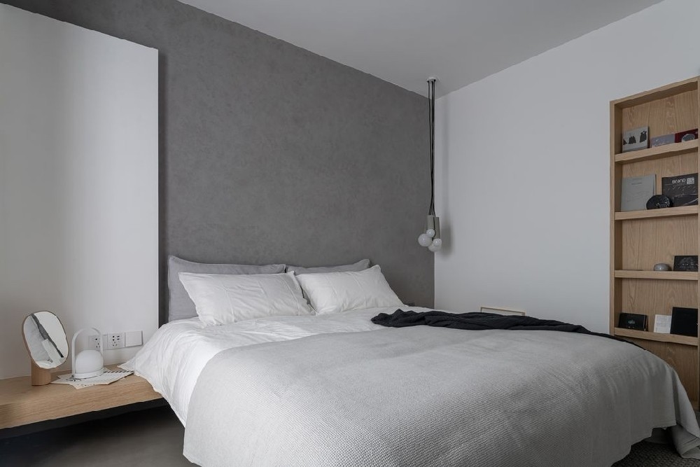 臥室在風(fēng)格上延續(xù)主空間的搭配方式,在形式上則重點(diǎn)營(yíng)造舒適度還原一個(gè)睡臥空間應(yīng)有的狀態(tài),在墻面水泥材質(zhì)的基礎(chǔ)之上左右兩面又分別做了白色墻面及體塊,營(yíng)造了一種被包裹在其中的舒適及安全感,白色體塊是利用了飄窗一部分空間做了臥室的集中隱蔽收納,邊緣部分又合理的結(jié)合了藏光為睡臥空間帶來(lái)豐富且舒適的光源環(huán)境,觸手可及的加大加深床頭飄板讓人使用起來(lái)更加有滿足感,床頭飄板和飄窗的臺(tái)面是相互延伸的造型起到了很好的空間拉伸作用。