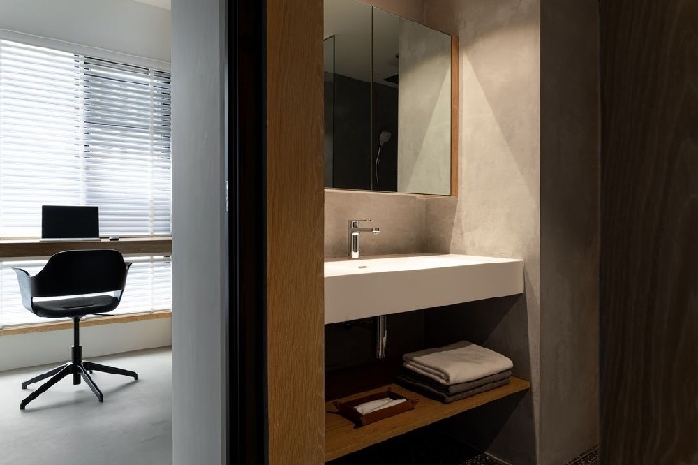 一個(gè)大面的鏡柜足以解決衛(wèi)浴空間零散的收納需求,再結(jié)合臺(tái)面及底層飄板的擺放位置足以應(yīng)對(duì)日常的洗漱沐浴如廁等功能的常態(tài)和臨時(shí)放置。超薄的洗手臺(tái)和飄板可以很好保證視覺(jué)的空間感相比臃腫的洗手臺(tái)柜更加適合極簡(jiǎn)空間。