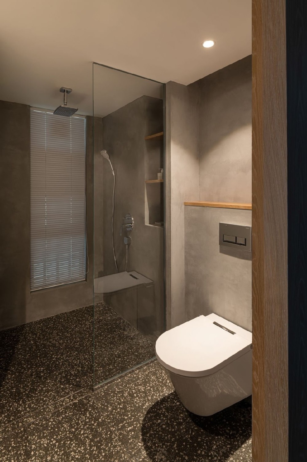 衛(wèi)生間作為純功能小空間比較容易出現(xiàn)擁擠的問(wèn)題,所以此次設(shè)計(jì)為了更好的空間感做了半干濕分離的設(shè)計(jì),通過(guò)一塊極簡(jiǎn)玻璃隔斷作為淋浴區(qū)與外部功能的阻隔,為了更好的輔助排水我們?cè)O(shè)計(jì)了兩條隱形地漏,一條用以內(nèi)部范圍主要排水另一條則輔助進(jìn)出口防止水漫出外面。