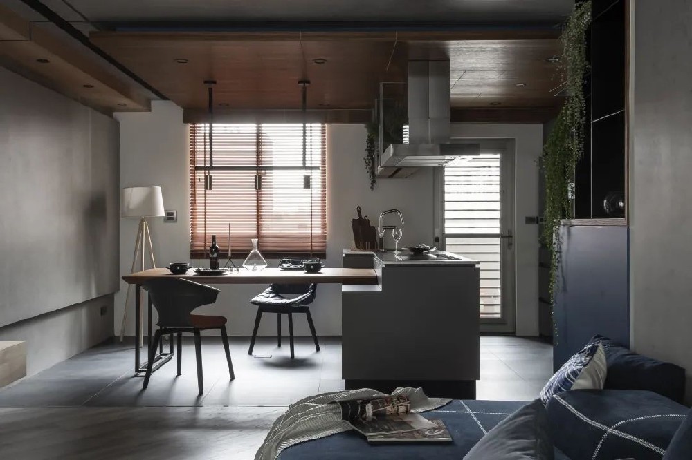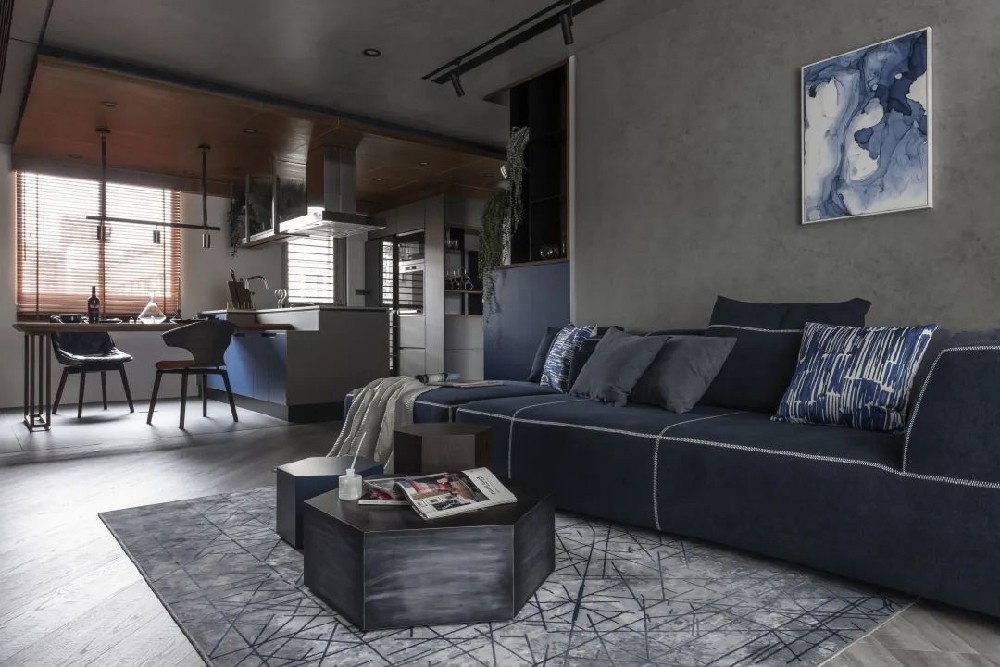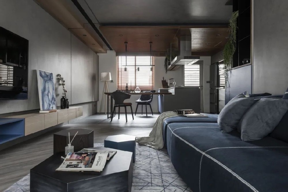 根據(jù)屋主對人生的規(guī)劃及生活的想望為藍(lán)圖,設(shè)計(jì)師把整體空間打造成一處以成熟的藍(lán)色 調(diào)與內(nèi)斂的清水墨為主調(diào),輔以深色木質(zhì)家具,充滿品味質(zhì)感的單身居所。
