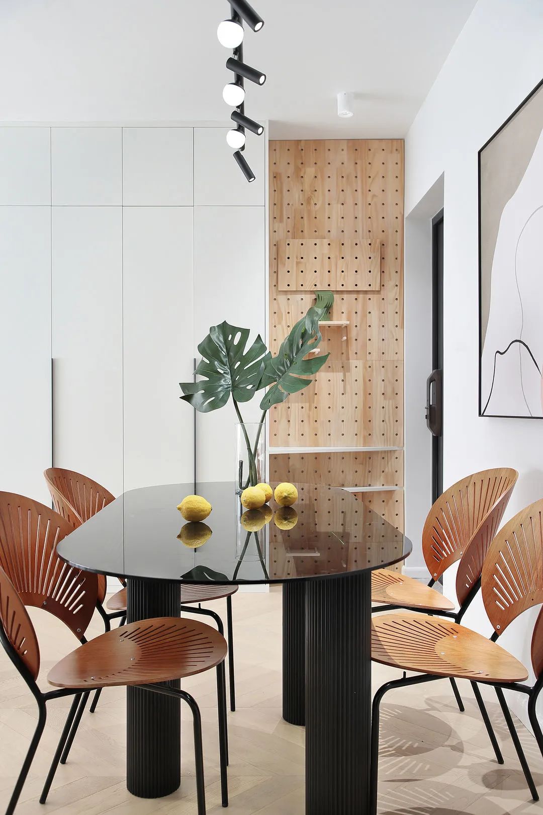 每一把椅子都是家里的藝術(shù)品,曲線的優(yōu)雅,鏤空的設(shè)計,餐桌上方吊燈的光線穿透椅子,呈現(xiàn)出扇形的光影。