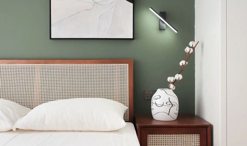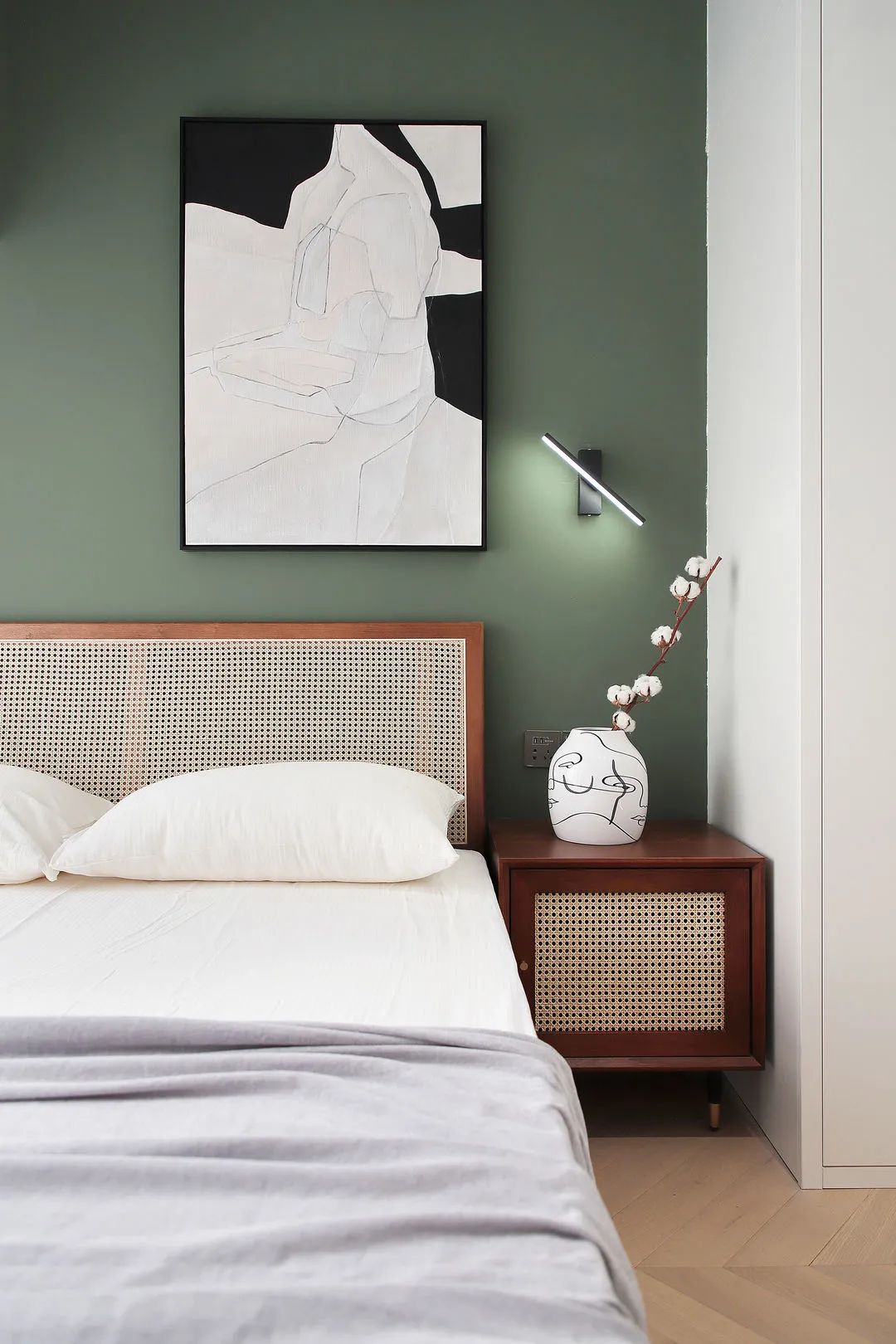 復(fù)古的墨綠色床頭背景墻與藤質(zhì)的床頭靠背、白色的衣柜,彰顯出的文藝與沉靜。通過掛畫、軟裝、整體搭配出舒適溫馨的睡眠環(huán)境。