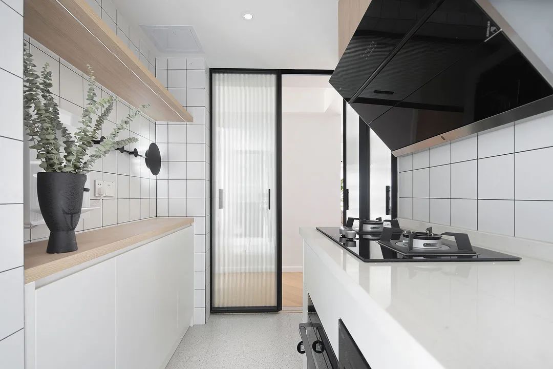 廚房做了無主燈設(shè)計,筒燈能讓整個空間更溫暖明亮有層次。原木色搭配小方磚、水磨石地板,整個空間清新自然,加入長虹玻璃的滑動門,為廚房空間賦予了另一種情調(diào)。下方做柜子,完美解決收納問題。