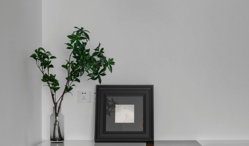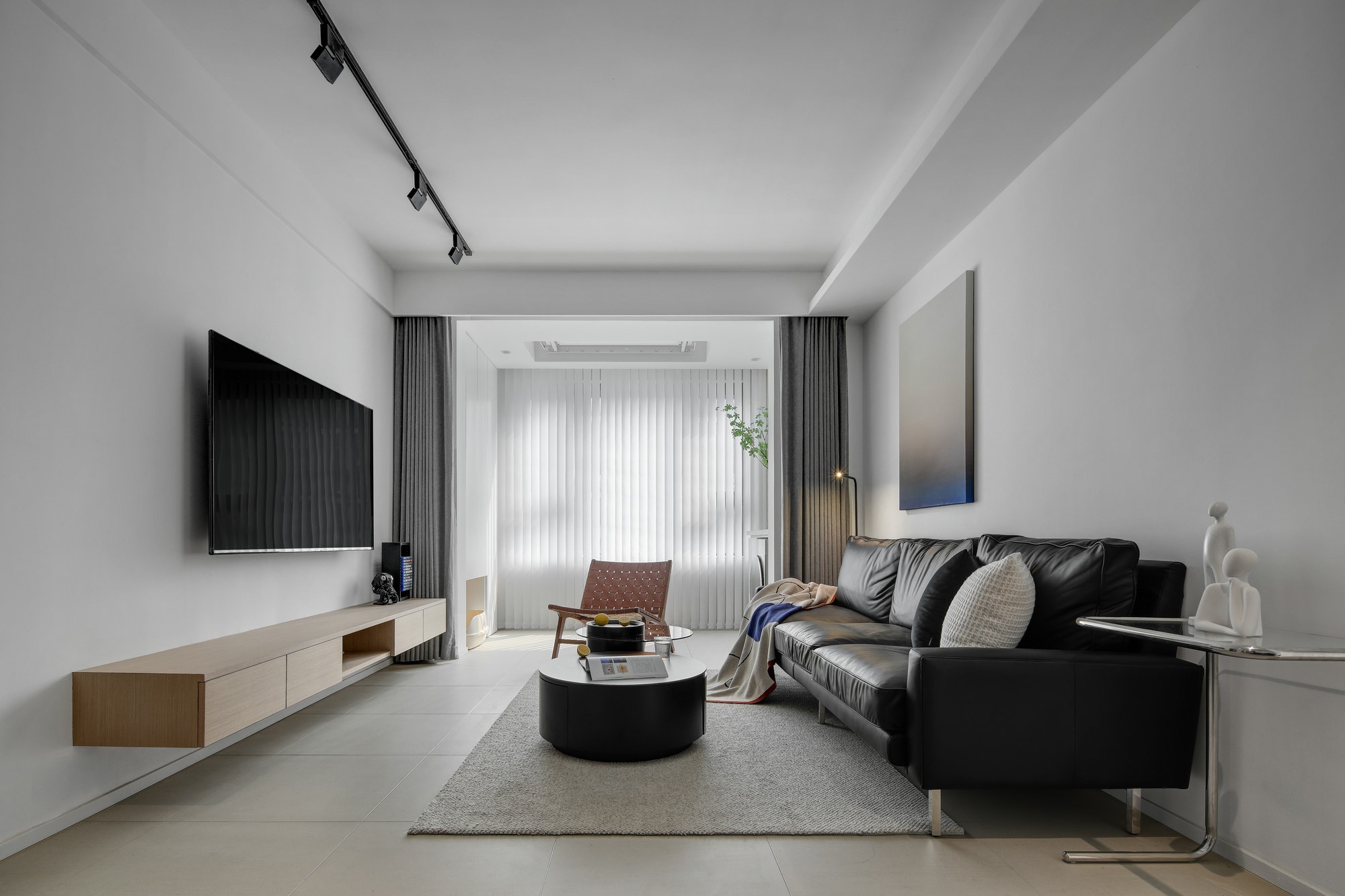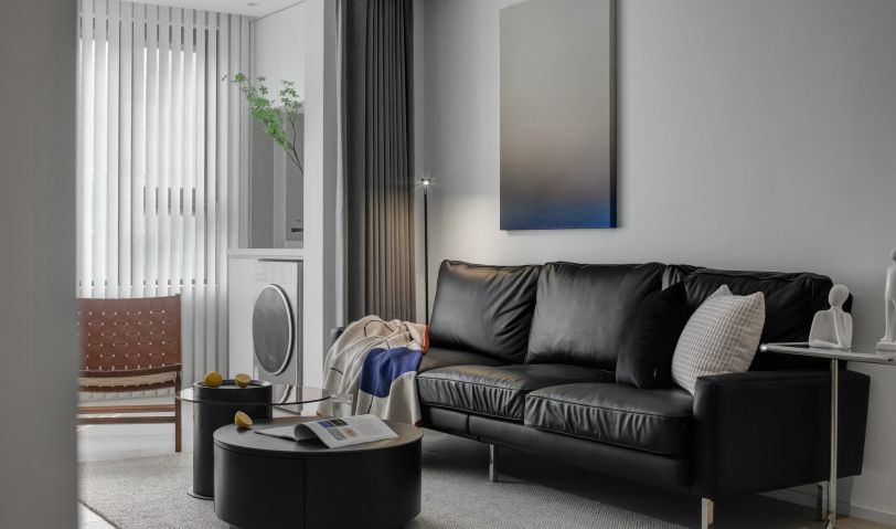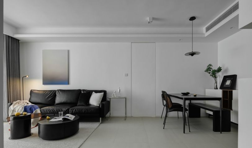 純白色沙發(fā)背景墻,黑色沙發(fā),一幅抽象掛畫裝飾墻面,讓空間充滿了意境。