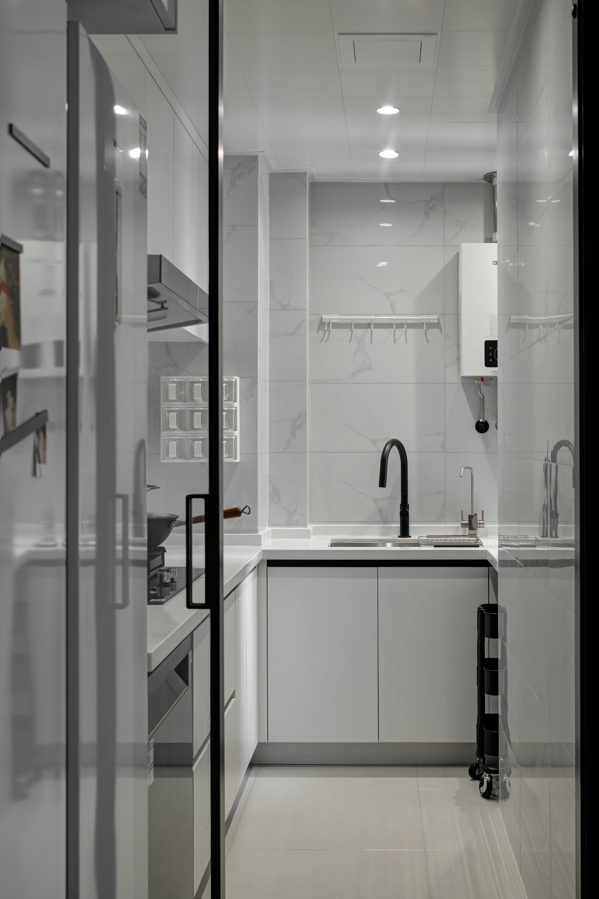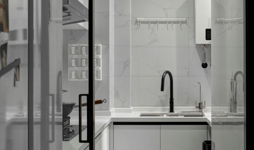廚房吊軌移門劃分空間,白色L型櫥柜,滿足廚房收納需求,冰箱位嵌入懸掛柜,保持空間整體感。