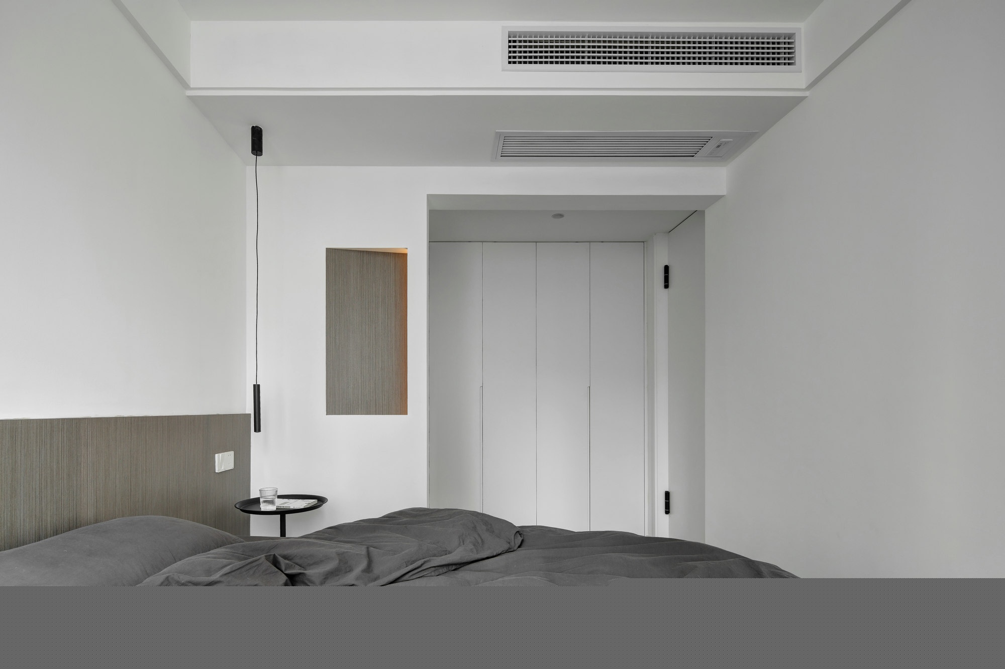 主臥床頭硬裝造型,設(shè)計(jì)感十足,一整面衣柜,增強(qiáng)儲(chǔ)物功能。