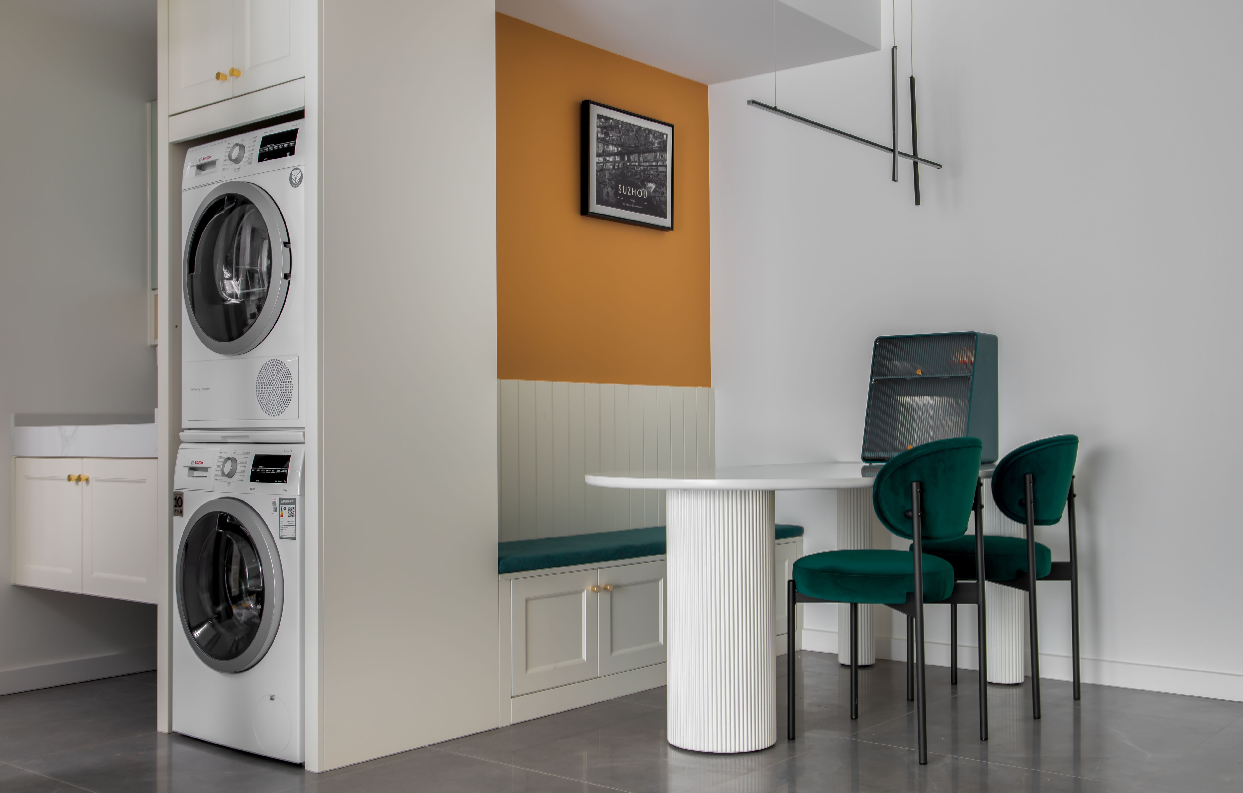 枯黃色乳膠漆使整個餐廳空間的氛圍更加溫暖,客廳采用卡座設計,增加儲物,滿足功能需求。
