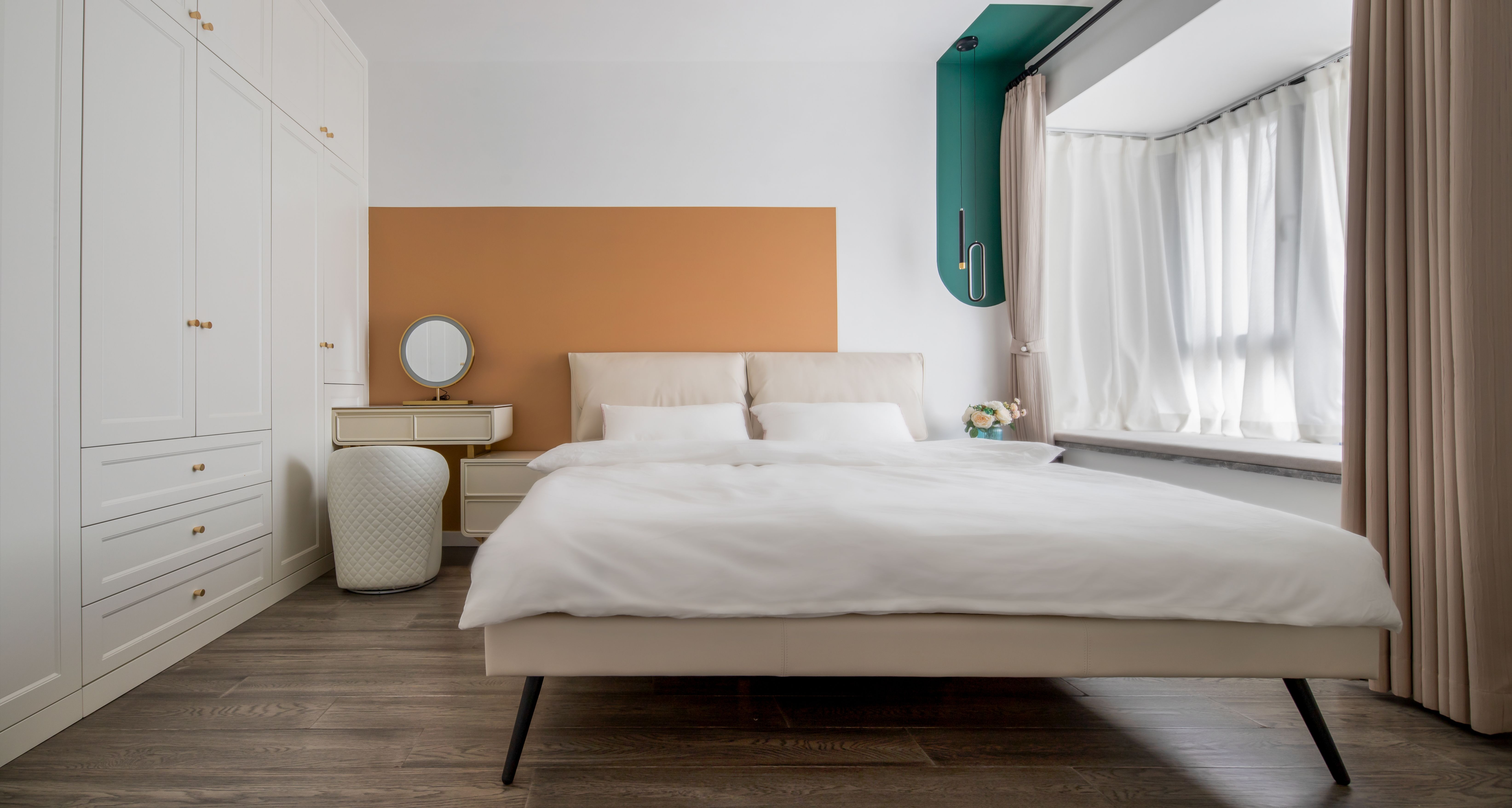 主臥采用了簡約的家具但是滿足了足量的收納需求,頂部隱藏式燈帶讓臥室更加有設計感,背景墻采用乳膠漆分開拼色使主臥空間更加生動有趣。