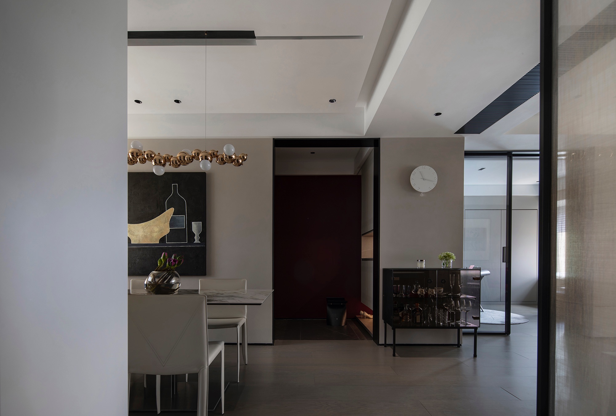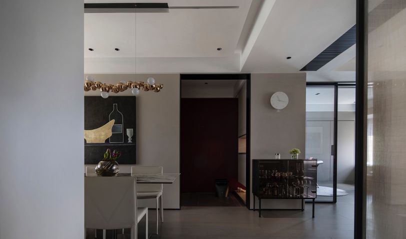 垂直線條游離于刻意與無(wú)意的形態(tài)之間,營(yíng)造出穩(wěn)定的空間感,拼接灰與白,穿插黑色,加強(qiáng)了縱深尺度,讓玄關(guān)擁有了開(kāi)門(mén)見(jiàn)山的意趣。以輕托重的設(shè)計(jì)手法,塑造出柜體質(zhì)感,光影相伴,浪漫愈發(fā)豐盈。
