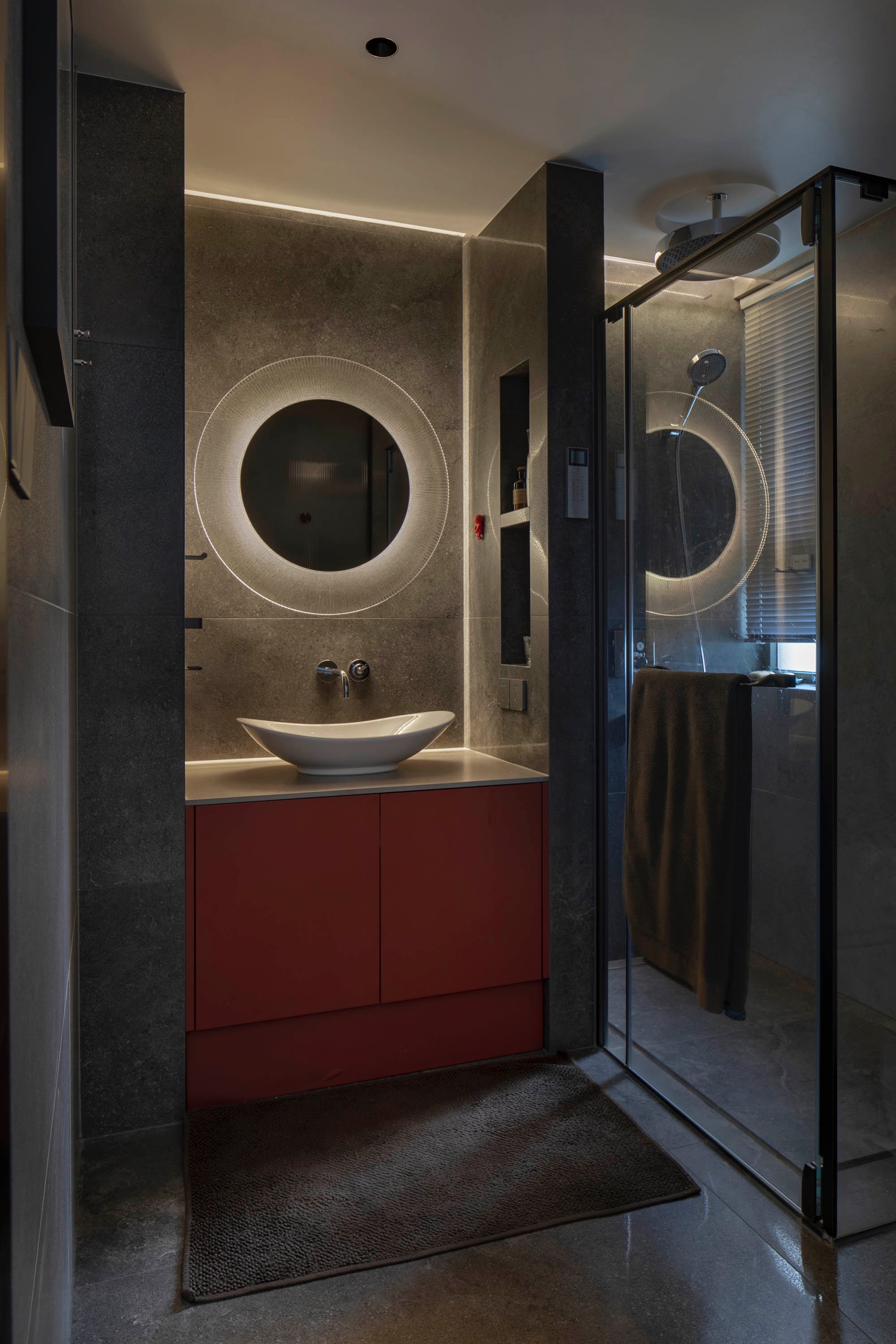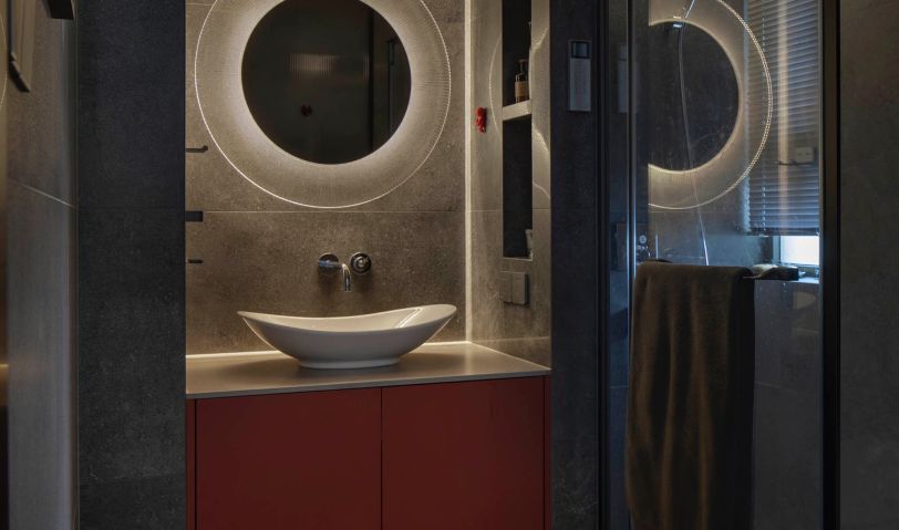 透明飾面分隔出干濕區(qū)域,并未隔斷衛(wèi)生間的整體性視野,以透光質(zhì)感染盡光的尺度,闡明了設(shè)計(jì)脈絡(luò)。在墻壁上補(bǔ)充置物功能,搭配定制柜體,強(qiáng)調(diào)品位與個(gè)性,滿足收納需求,帶來(lái)高級(jí)的生活體驗(yàn)。透明飾面分隔出干濕區(qū)域,并未隔斷衛(wèi)生間的整體性視野,以透光質(zhì)感染盡光的尺度,闡明了設(shè)計(jì)脈絡(luò)。