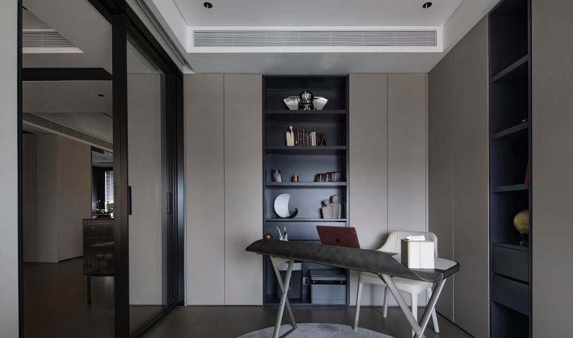 遵循開(kāi)放式結(jié)構(gòu)的美學(xué),以虛實(shí)互動(dòng)的情態(tài)與客廳重建空間關(guān)系,借橫向書(shū)桌切割直角區(qū)域,增添柔軟織物與明亮跳色,延續(xù)主場(chǎng)空間的設(shè)計(jì)手法,于整體性中彰顯獨(dú)屬特色。展示架以其精彩的展品,捕捉天光,營(yíng)造寧?kù)o致遠(yuǎn)的氛圍。
