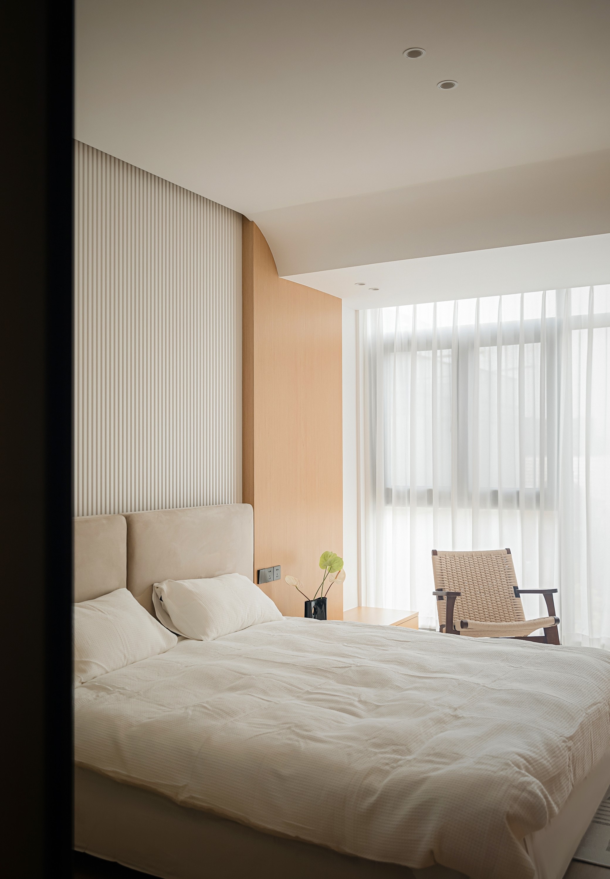 大面積白色墻面保持最基本的視覺清爽,利用不規(guī)則的壁龕拓展了平面方向的空間敘事,以幾何美感和視覺的微妙差異營造全新的空間知覺。