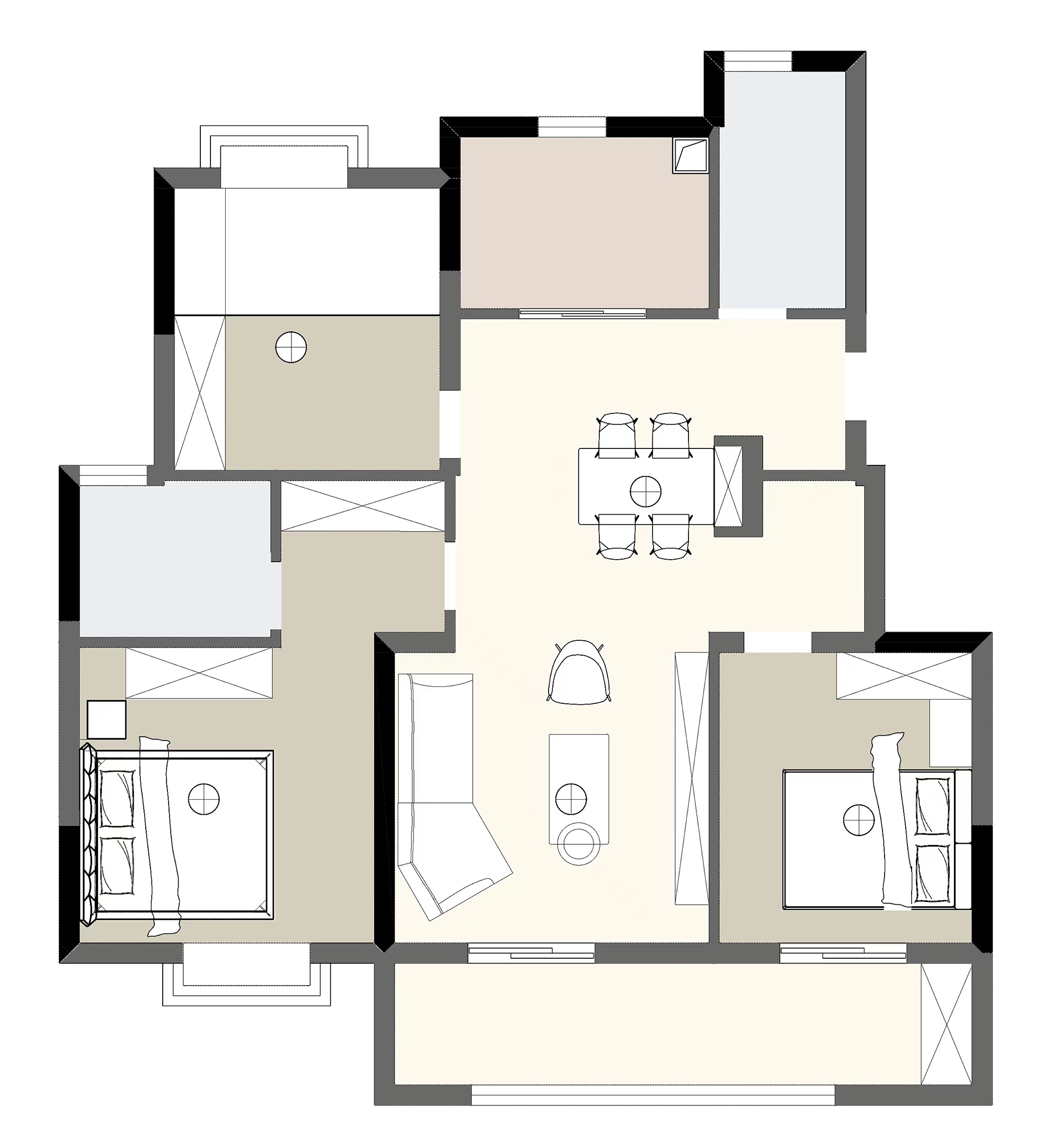調(diào)節(jié)色塊的比例,汲取粉色系的甜美闡明空間基調(diào),通過寬與窄、橫與縱、深與淺的對比,煥發(fā)棲居的愉悅性、自在性、滿足感。懸空架構(gòu),利用隔空關(guān)系展現(xiàn)輕盈之美,同時(shí)容納實(shí)用功能,打造生動場景。