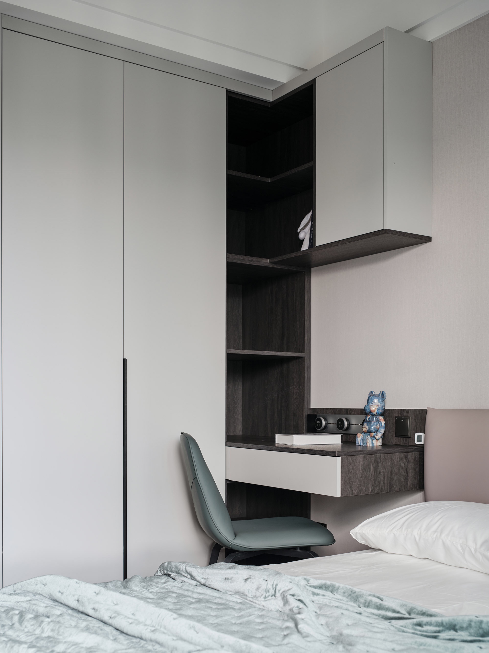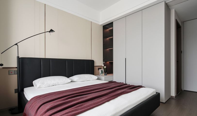 選用暗色調(diào)加強(qiáng)空間的簡雅質(zhì)感,借細(xì)膩木紋為睡眠環(huán)境嫁接親密性,串聯(lián)富有情調(diào)的布藝,隨著豎向線條的分割、轉(zhuǎn)折、排列,流露出沉靜的氣氛。定制通頂柜體保持統(tǒng)一美感,布置層架細(xì)節(jié),表達(dá)收納和展示的趣致。