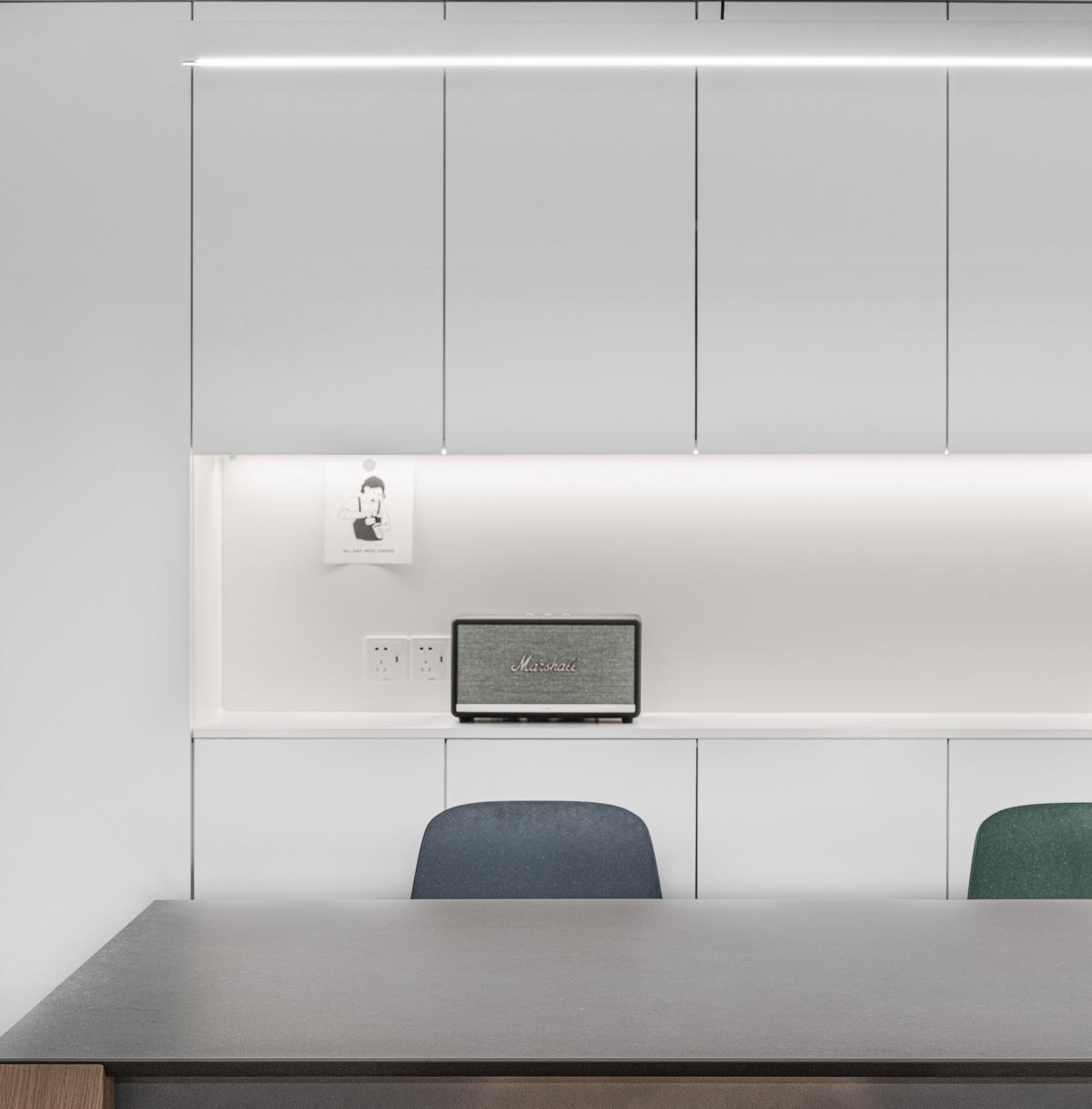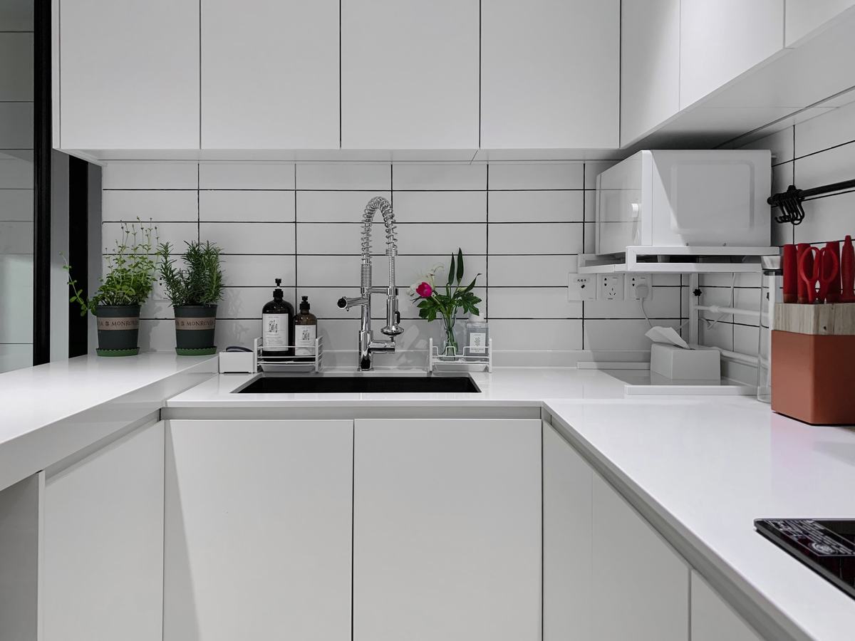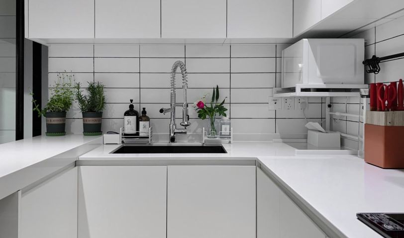 女主人喜歡美食、烹飪,經(jīng)常在周末和節(jié)假日邀請朋友在家里開party,因此我們在功能布局上把廚房和客餐廳多余的隔墻全部打掉,形成一個整體的大空間,使整個空間更加通透明亮,廚房采用可以推拉的玻璃隔斷,讓空間可分可合。女主人做飯之余還可以與家人朋友進行互動交流,廚房也不再是傳統(tǒng)意義上的封閉而單一的“食物加工生產(chǎn)車間”。在向內(nèi)的功能與對外的情感中找到了一種平衡,開放的空間使各個功能可以很好的共生,它們各自獨立又相互融合。