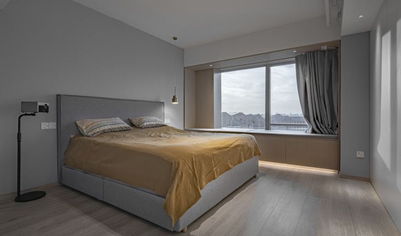 同樣的簡約設(shè)計手法和語言貫穿到臥室空間。男女主人喜歡睡前躺在床上看電影,這是他們最為放松和幸福的時刻,投影便成了他們最好的伙伴。