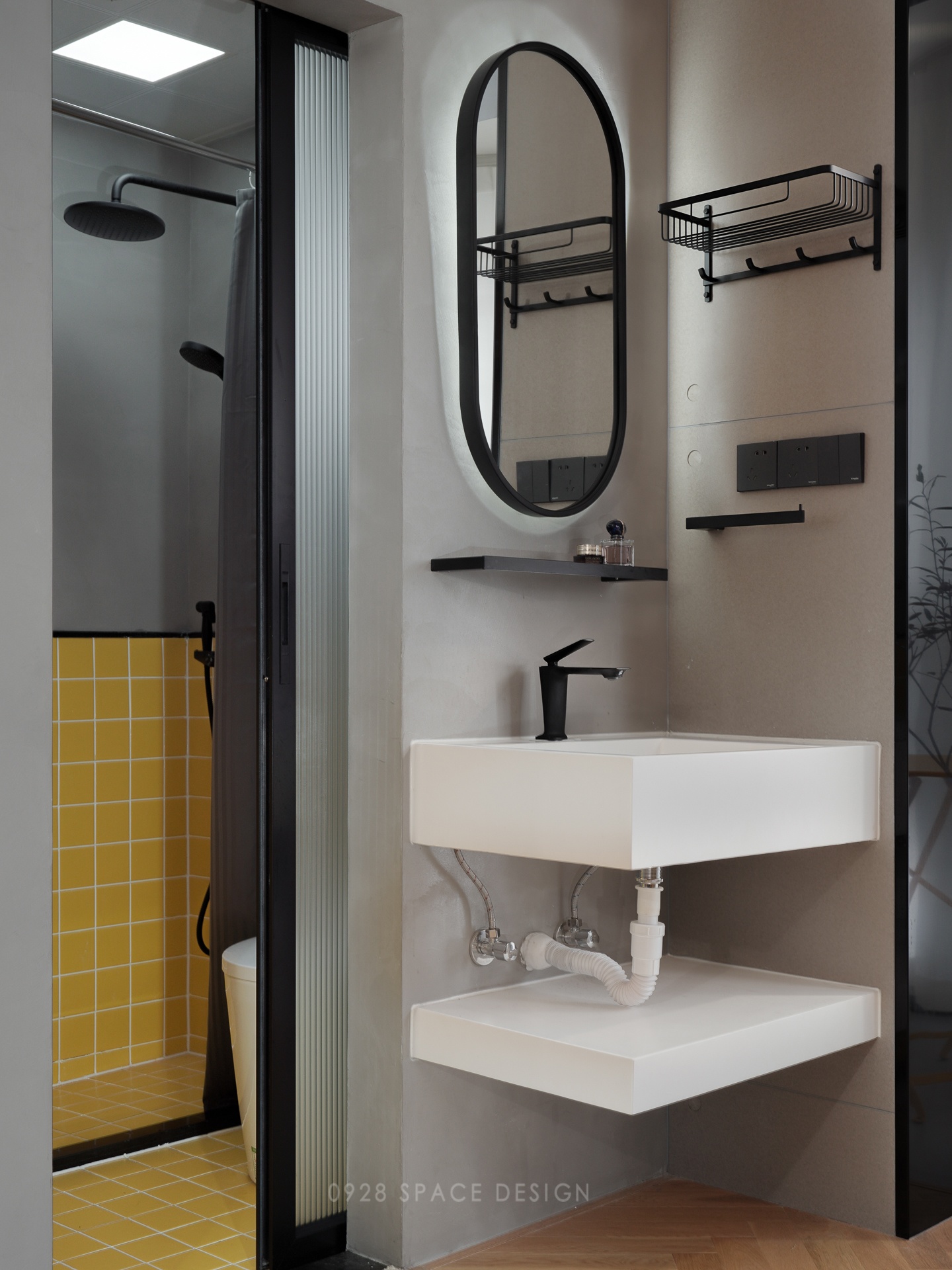衛(wèi)生間作為一個(gè)獨(dú)立的空間,改變開門的位置,與廚房相鄰,洗手臺(tái)外置,實(shí)現(xiàn)干濕分離。