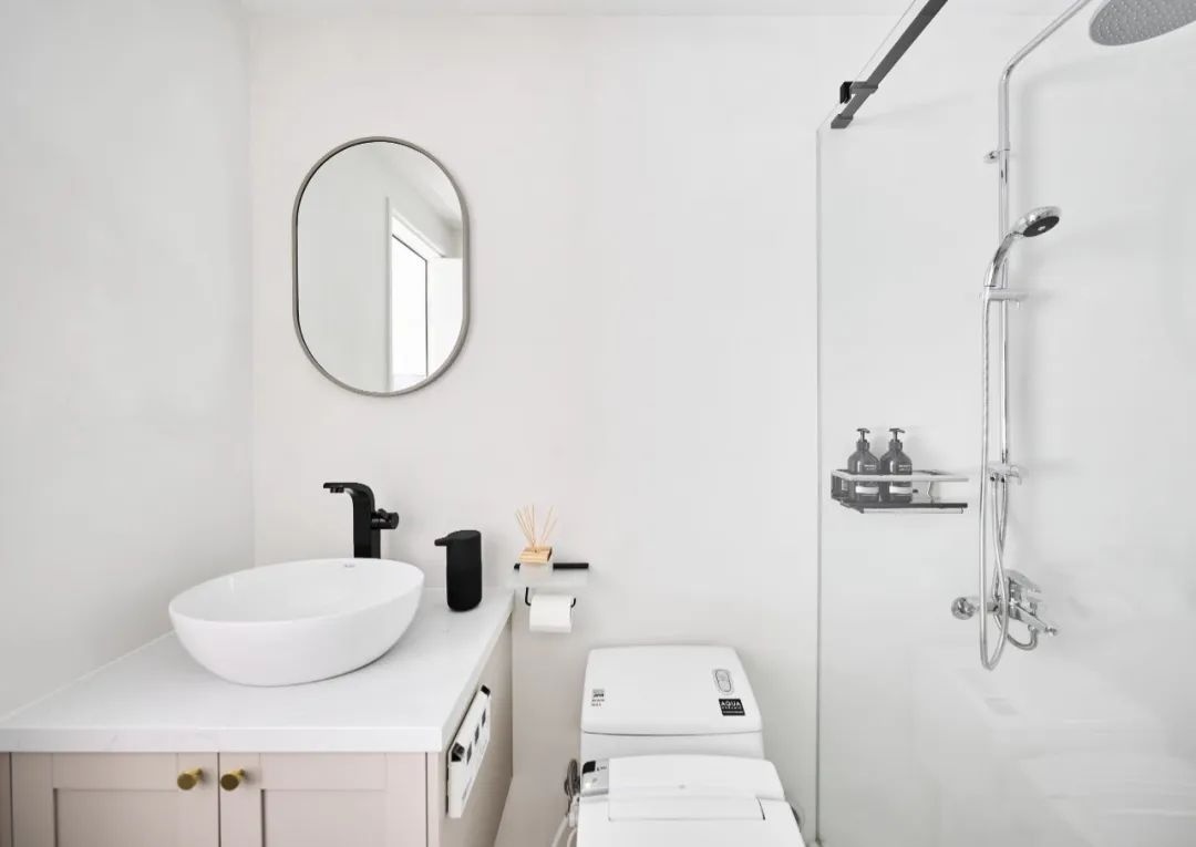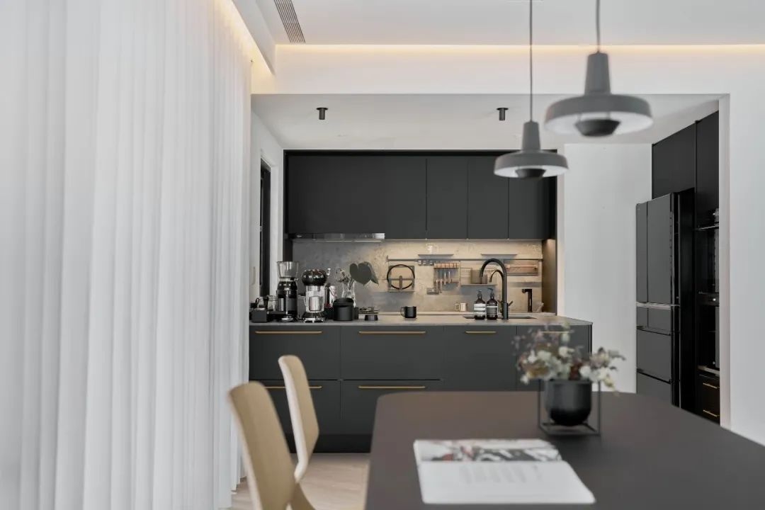 餐廚區(qū)以黑色為主旋律,在有形的空間中以無形劃分功能區(qū)之間的界限。黑色本身就是時尚的代名詞,又能使人的注意力集中,足以見得設(shè)計師的用心。