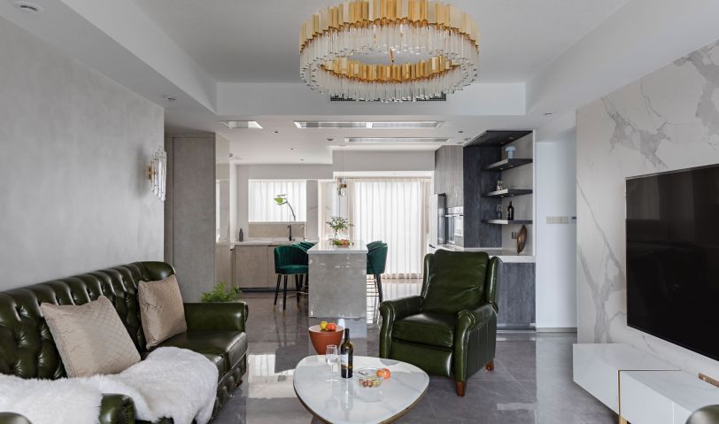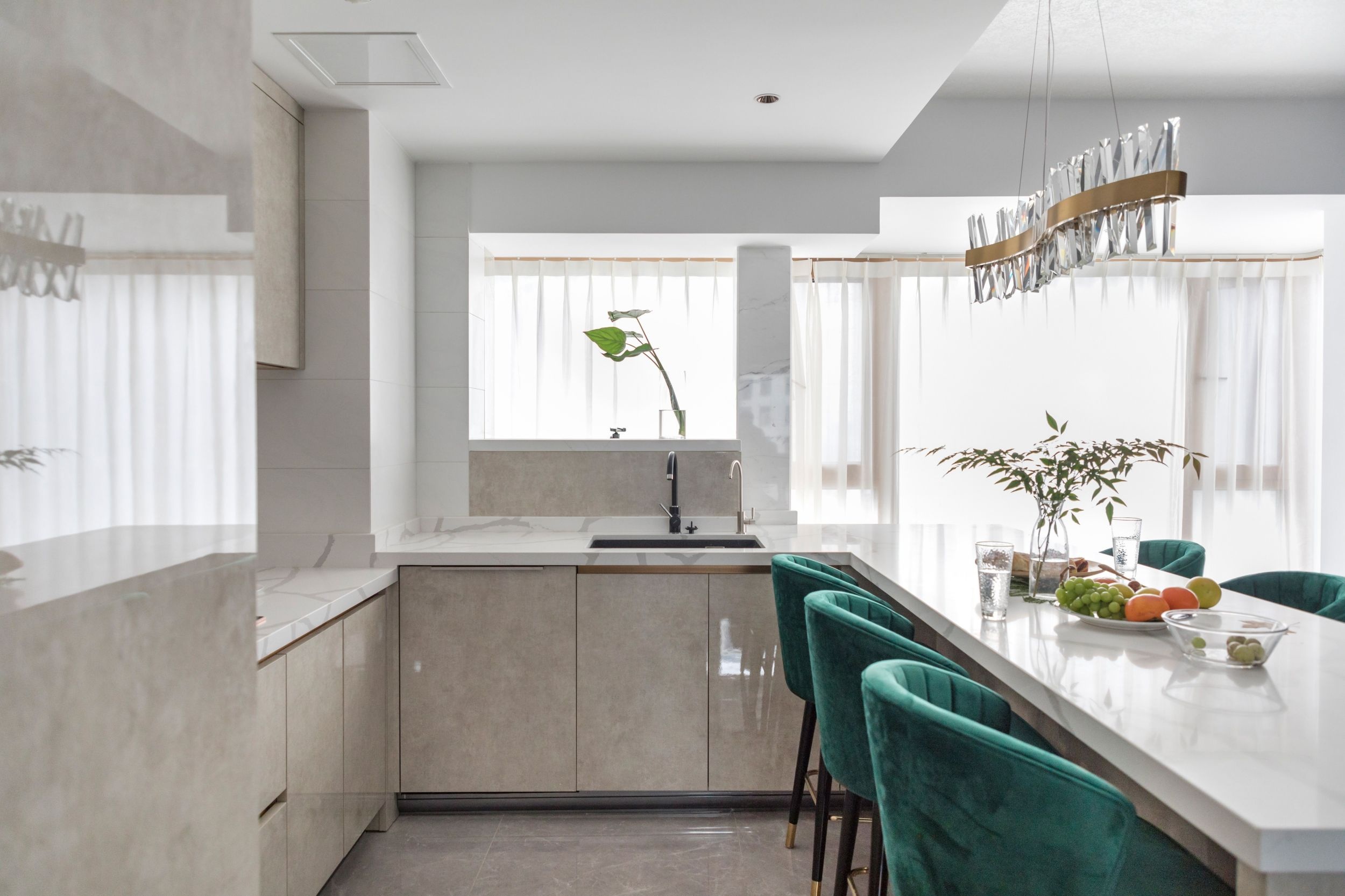 開放式廚房中間的島臺(tái)兼具用餐以及會(huì)客功能,右側(cè)將冰箱、烤箱等設(shè)備嵌入收納墻中,設(shè)計(jì)感滿滿的同時(shí),也提升了空間的功能性。