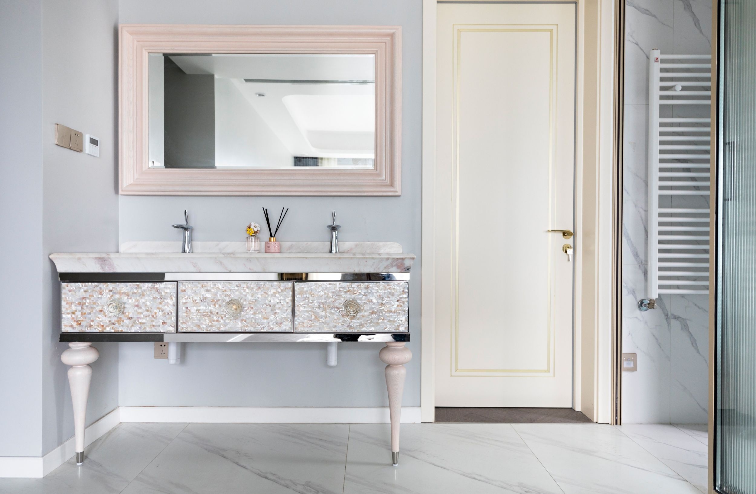 主臥衛(wèi)生間采用長(zhǎng)虹玻璃,讓空間的通透性保證最大的情況下又保證的隱私。香檳金的窄邊框與整個(gè)空間干凈的配色又美又協(xié)調(diào)。
